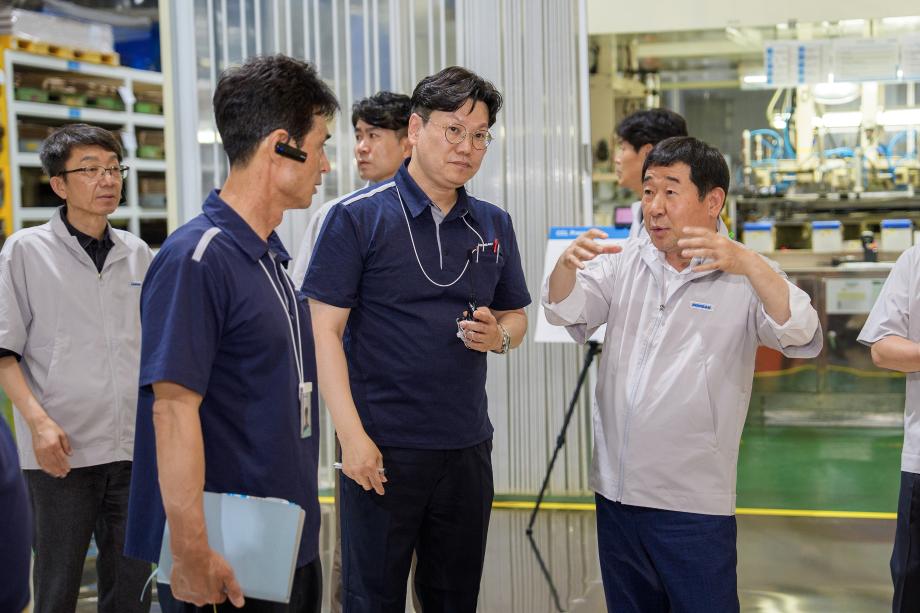 이재영 충북 증평군수가 지역대표 첨단 제조업체인 ㈜두산 증평공장을 찾아 기업 현장을 직접 둘러보고, 기업과의 상생과 동반성장 의지를 다졌다.