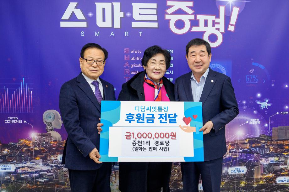 충북 증평군은 증평읍 증천1리 경로당(노인회장 양경자) 회원들이 11일 군청을 방문해 아동발달지원계좌(디딤씨앗통장) 대상 아동들을 위한 성금 100만 원을 기탁했다고 밝혔다.