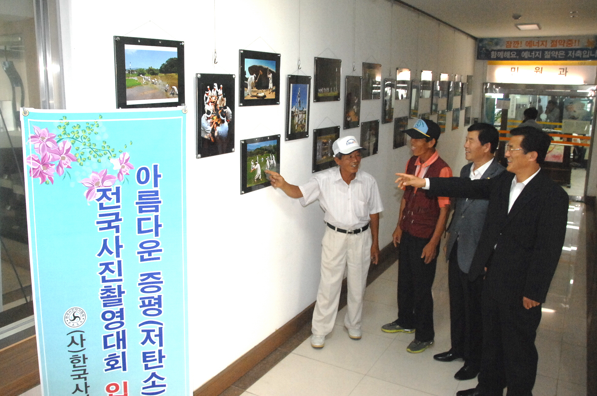 1. 증평군청 1층 민원실 입구 복도에 전시된 "제2회 아름다운 증평(저탄소)녹색 전국사진 촬영대회에 입상작 관람