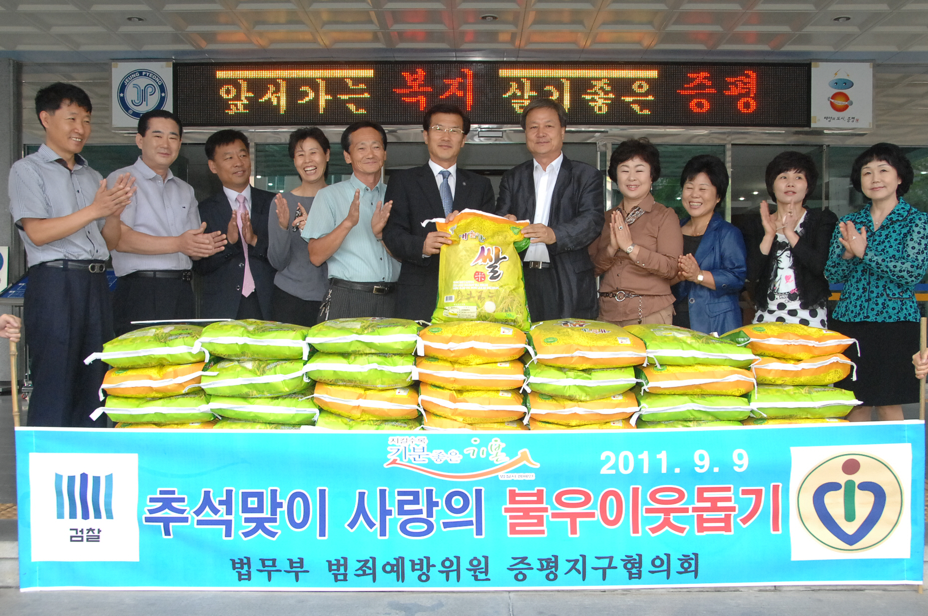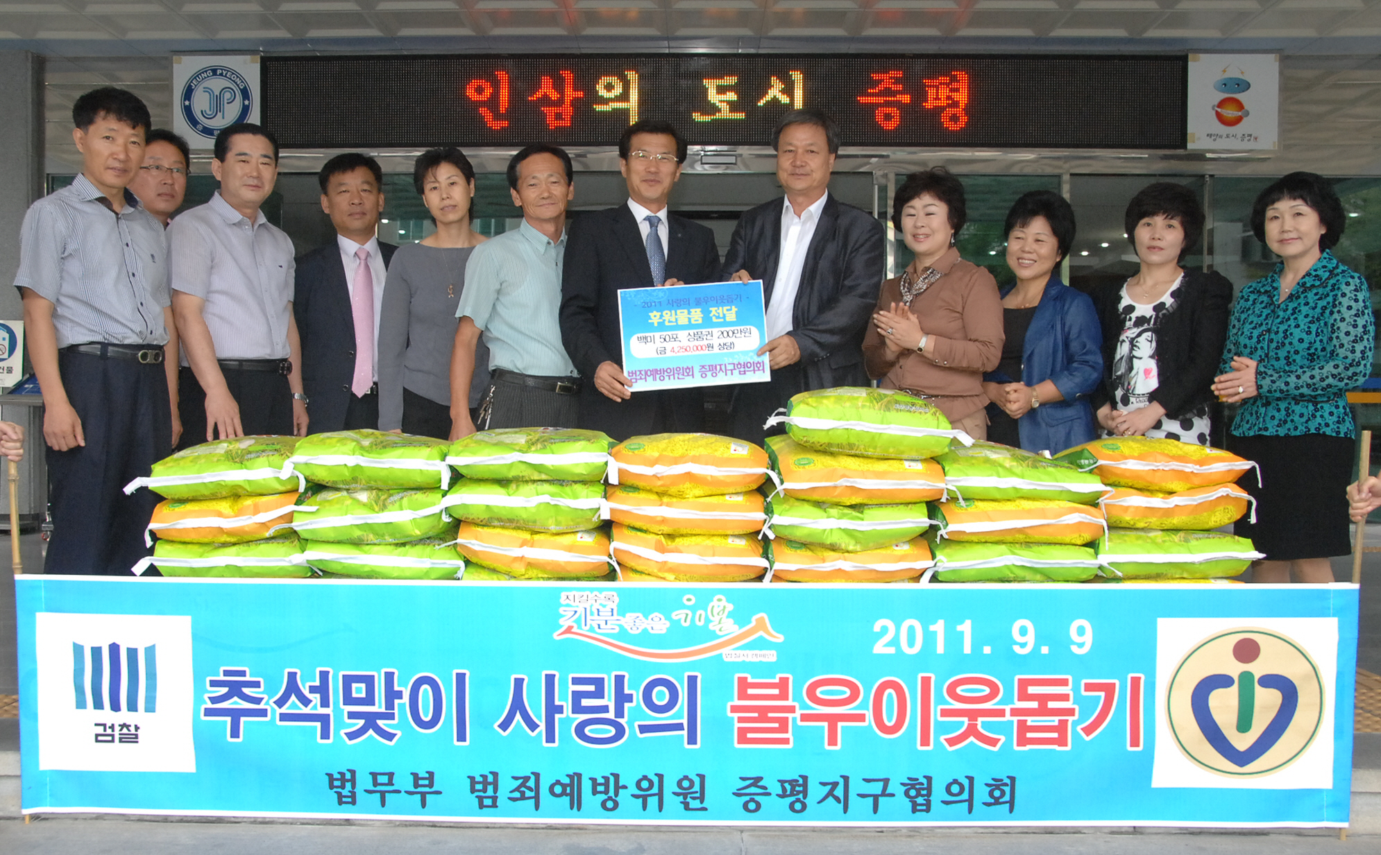 9월9일, 범죄예방위원회 증평지구협의회(회장 박성현)로 부터 한가위를 앞두고 지역 내 형편이 어려운 이웃을 위해 써 달라며 백미 20Kg들이 50포와 200만원 상당의 상품권을 기탁 받음