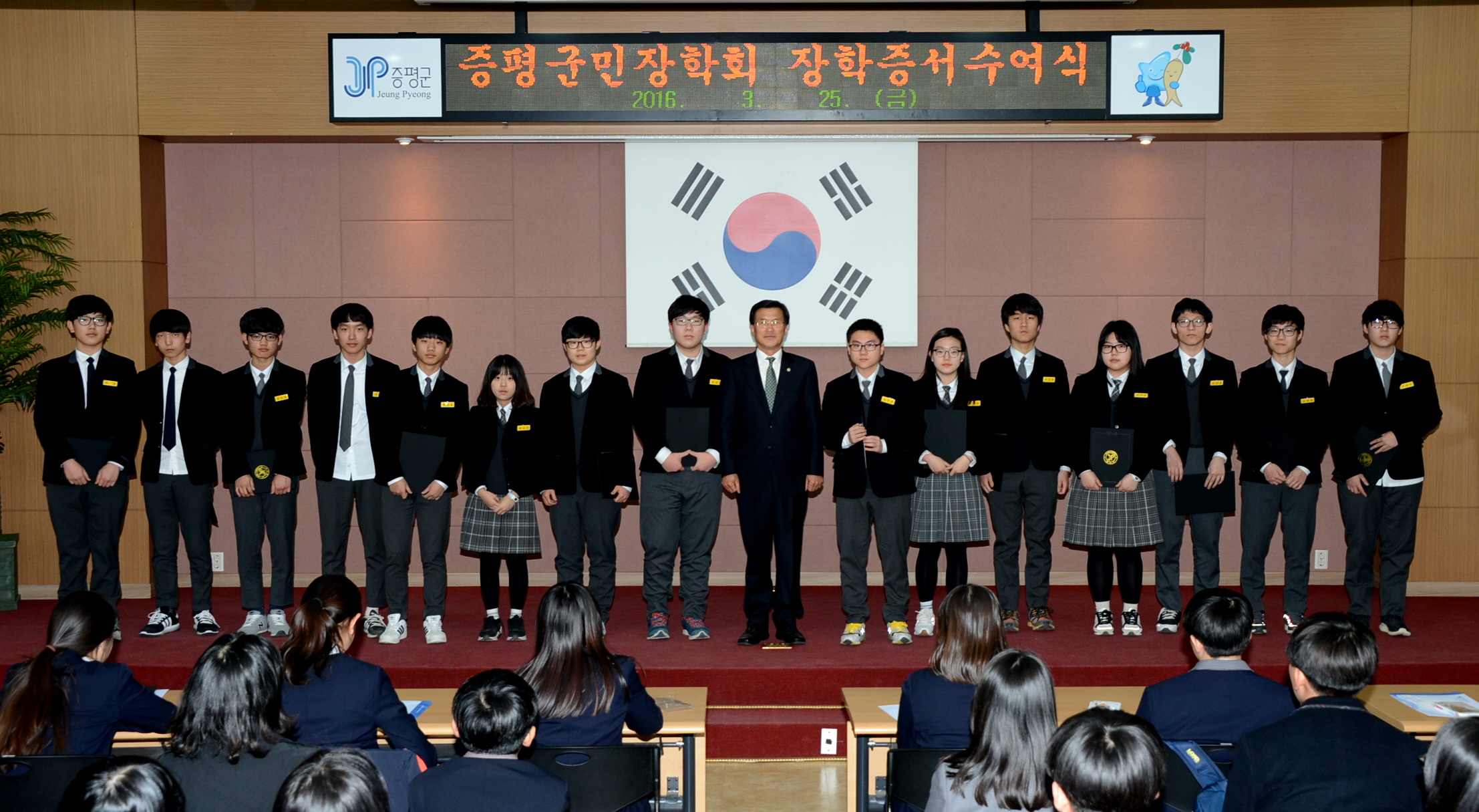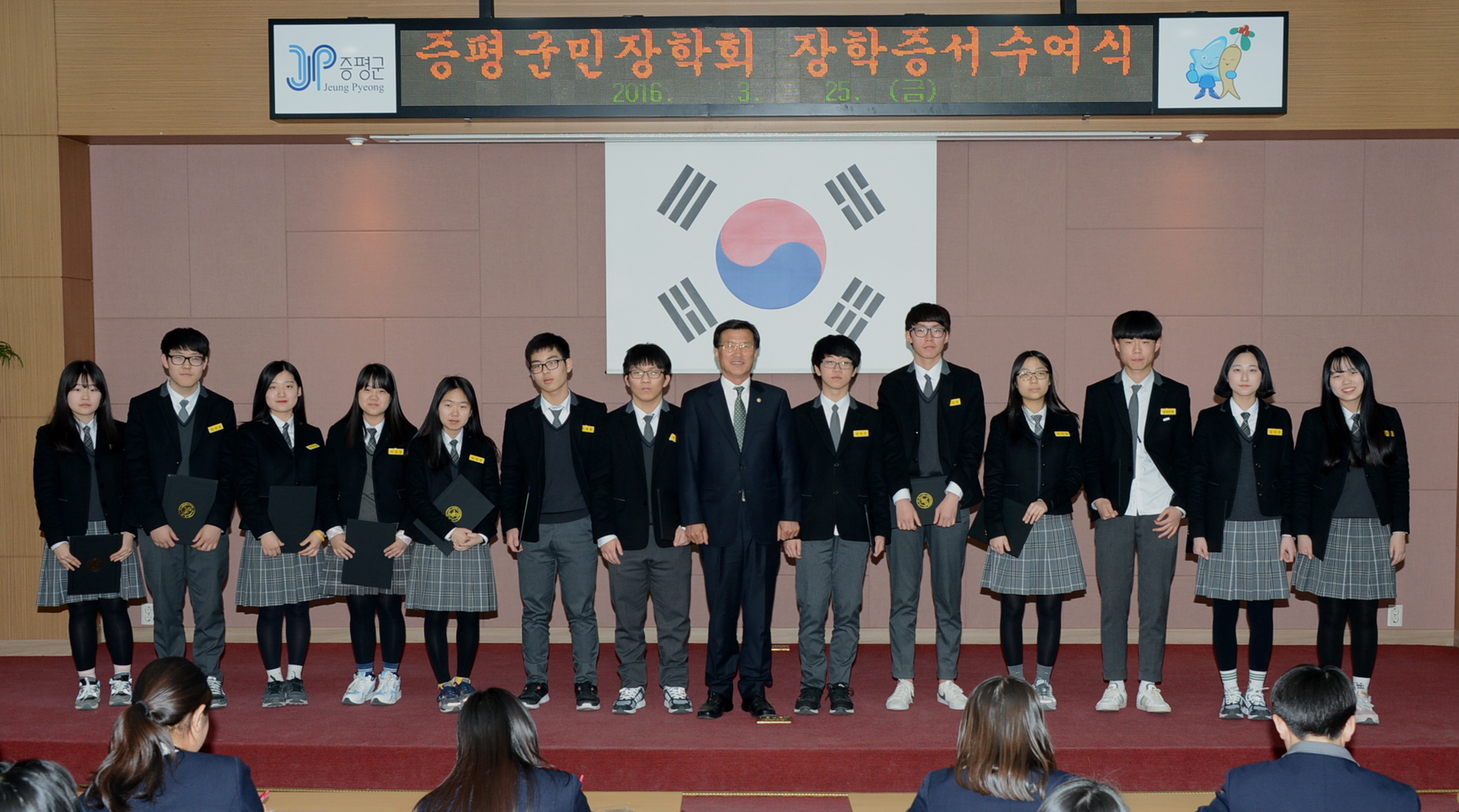 [재]증평군민장학회(이사장 홍성열 증평군수)는 25일 증평군청 대회의실에서 2016년 입학성적 우수 장학생 54명에게 6,340만원의 장학금을 지급했다.(보도자료실 참조)