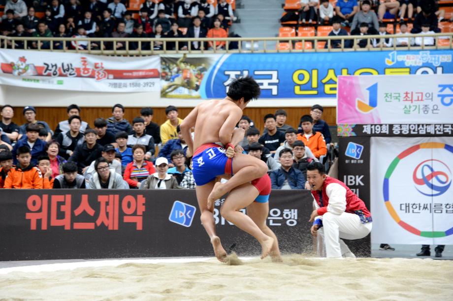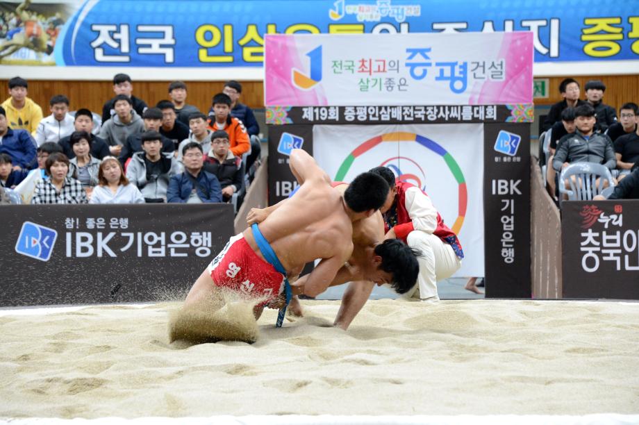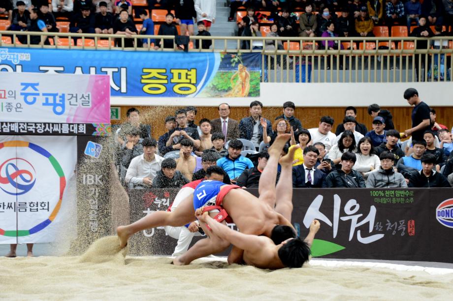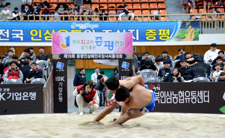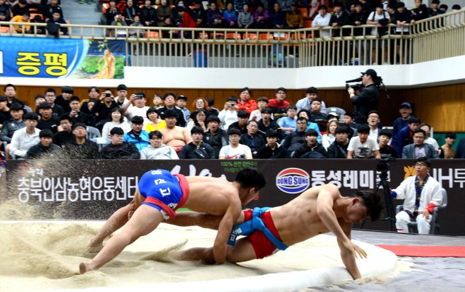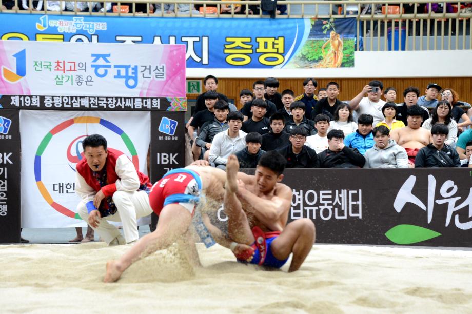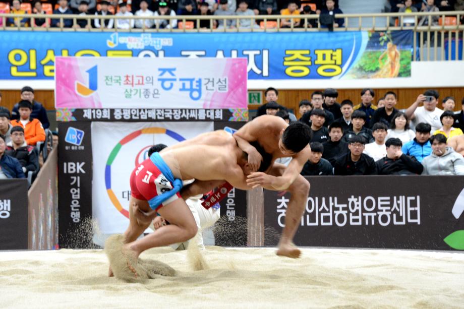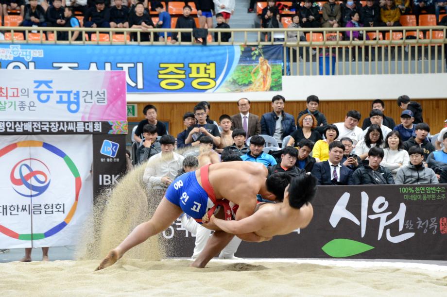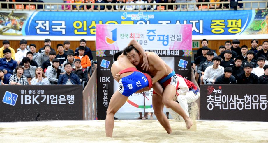 제19회 ‘증평 인삼배 전국장사씨름대회’가 8일부터 14일(7일간)까지 증평읍 송산리 증평종합스포츠센터에서 열리는 가운데 9일 열린 하이라이트