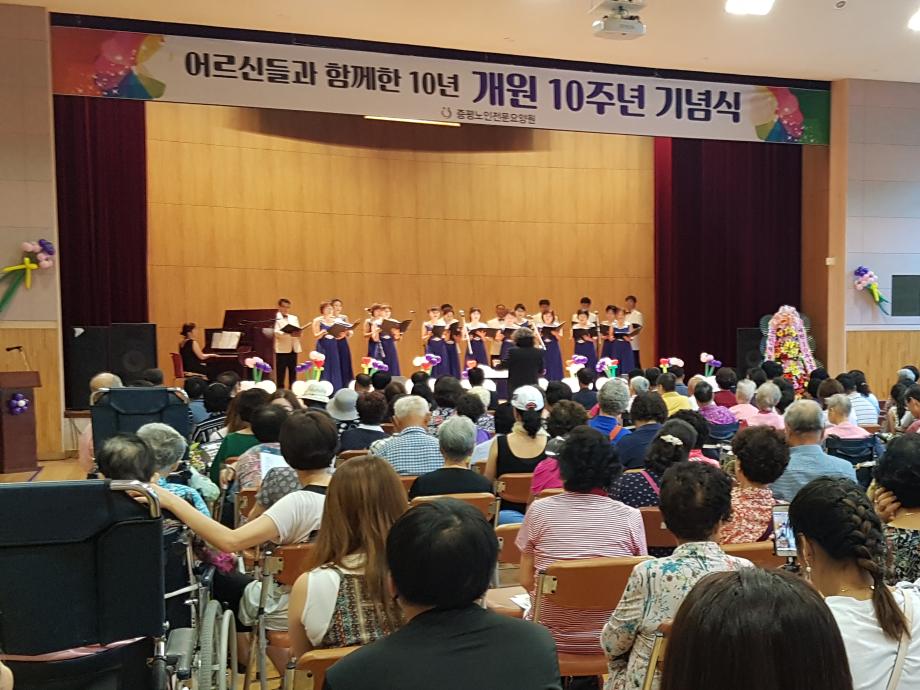 증평노인전문요양원(원장 이흥식)은 지난 7일 증평읍 내성리 증평군청소년수련관 다목적 강당에서‘어르신과 함께한 10년, 증평노인전문요양원 개원 10주년 기념 음악회’를 개최했다.