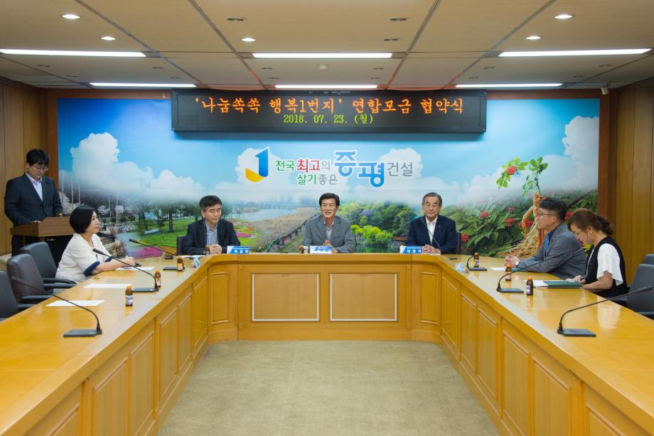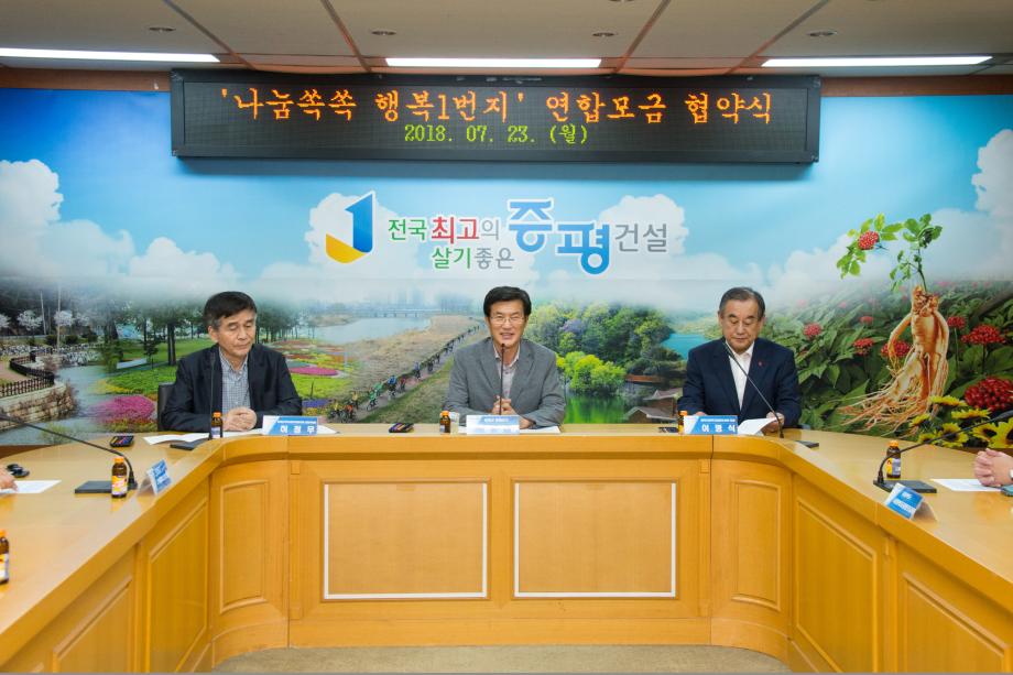 증평군과 충북사회복지공동모금회(회장 이명식), 증평군지역사회보장협의체(공동위원장 허정무)는 23일 군청 소회의실에서‘나눔쏙쏙 행복 1번지 연합모금’협약을 체결했다