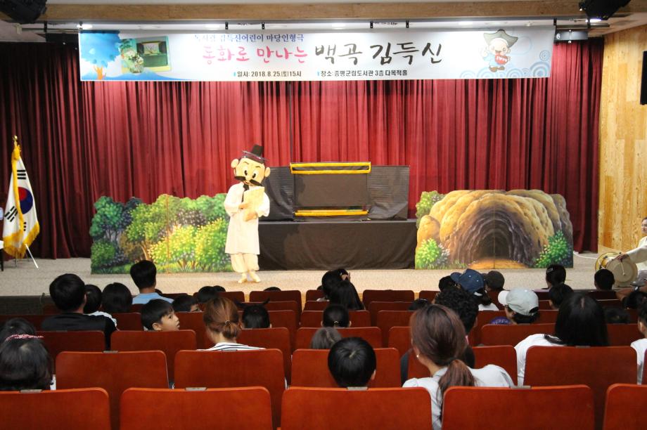 증평군이 김득신 독서문화놀이터 사업의 일환으로 지난 25일 증평읍 송산리 증평군립도서관에서‘동화로 만나는 백곡 김득신’인형마당극을 공연해 주민들로부터 큰 호응을 얻었다.