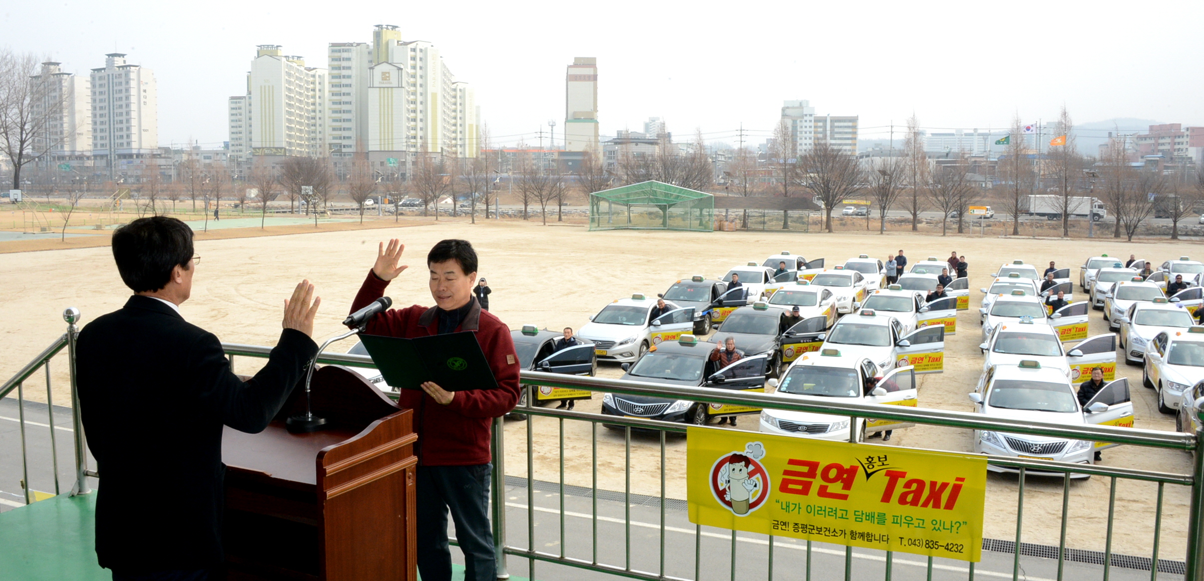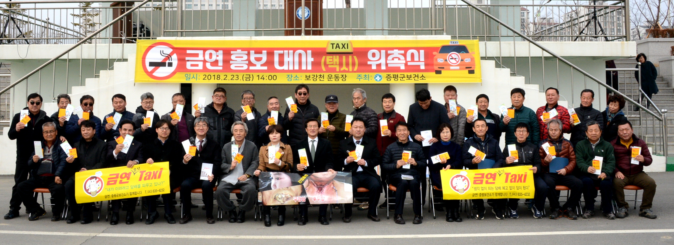 전국에서 유일하게 금연홍보택시를 운영 중인 증평군이 지난해에 이어 23일 증평읍 송산리 보강천체육공원에서 금연 문화 확산을 위한 2018년 금연홍보대사(택시) 위촉식을 갖고 금연홍보택시 운영키로 했다.(보도자료실 참조)