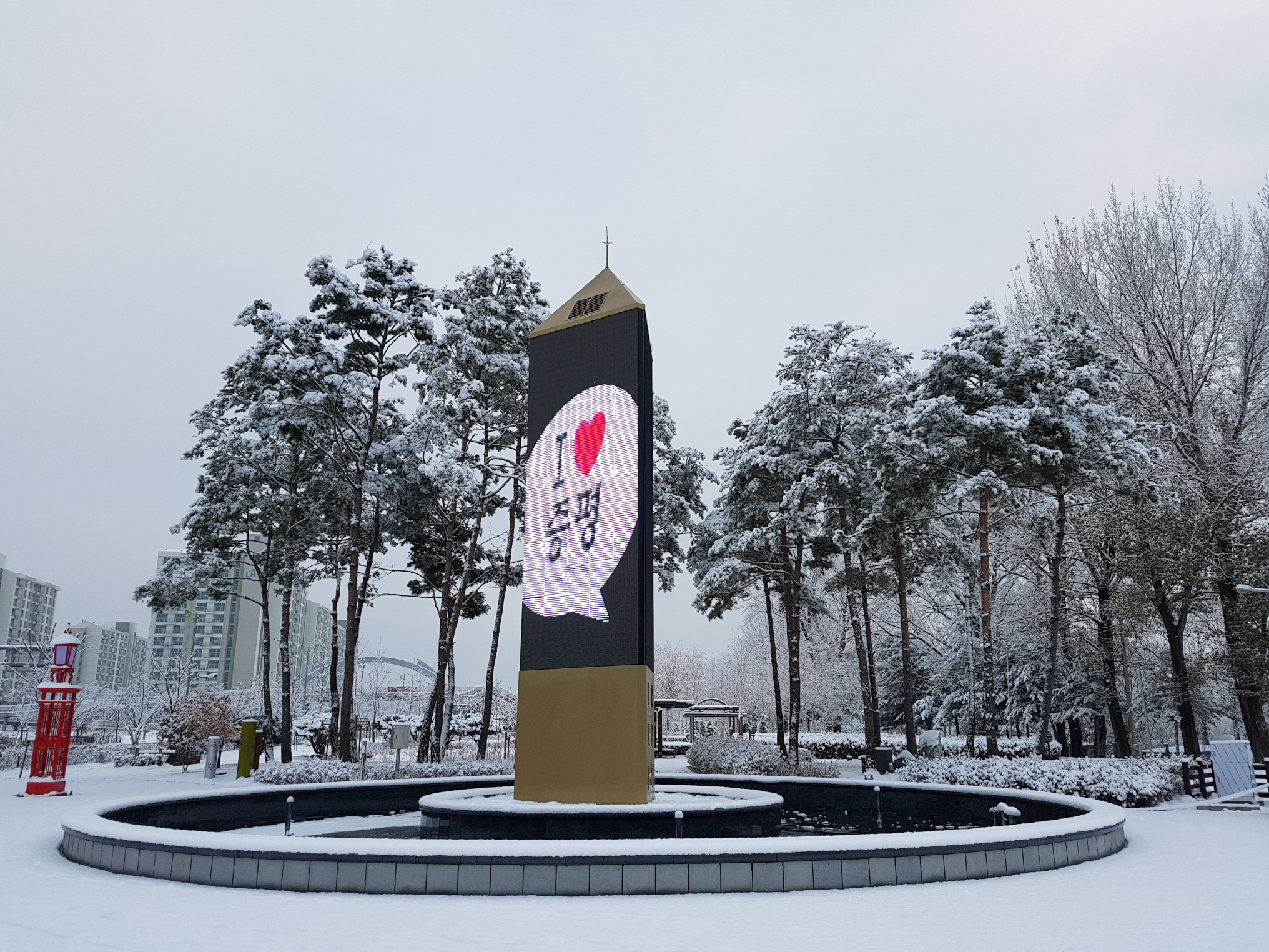 증평군이 증평읍 송산리 일원의 유동인구가 많은 보강천 미루나무숲 주변, 광장로와 인삼로의 교차지역에 미디어파사드 형식을 통해 조성한 그린시티타워가 눈길을 끌고 있다.(보도자료실 참조)