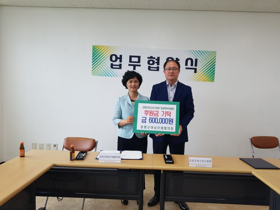 증평군청소년수련관(관장 김병노)은 10일 증평군청소년수련관 회의실에서 증평군여성단체협의회(회장 이상원)와 업무협약식 체결과 후원금을 전달했다.