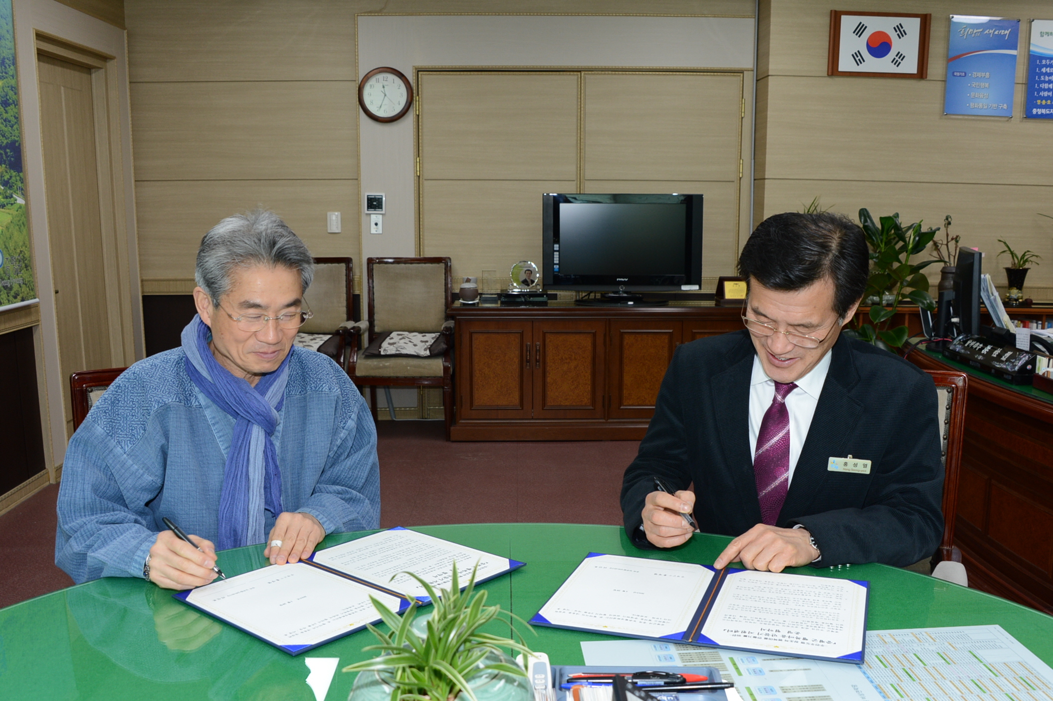 증평군(군수 홍성열)과 충북농촌활성화지원센터(센터장 리신호 교수)가 28일 증평군 행복마을 만들기 지원센터 구축․운영을 위한 업무협약을 체결했다. [보도자료실 참조]