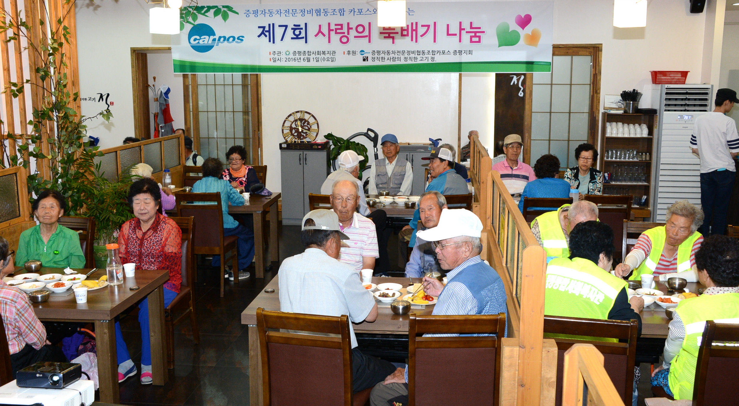 증평종합사회복지관(과장 양천공)에서는 1일 오전 11시 카포스 증평지회 회원들과 함께 증평 송산리에 위치한 정직한고기 정에서 소외계층 및 독거어르신 100여명에게 무료로 점심식사를 대접했다.(보도자료실 참조)