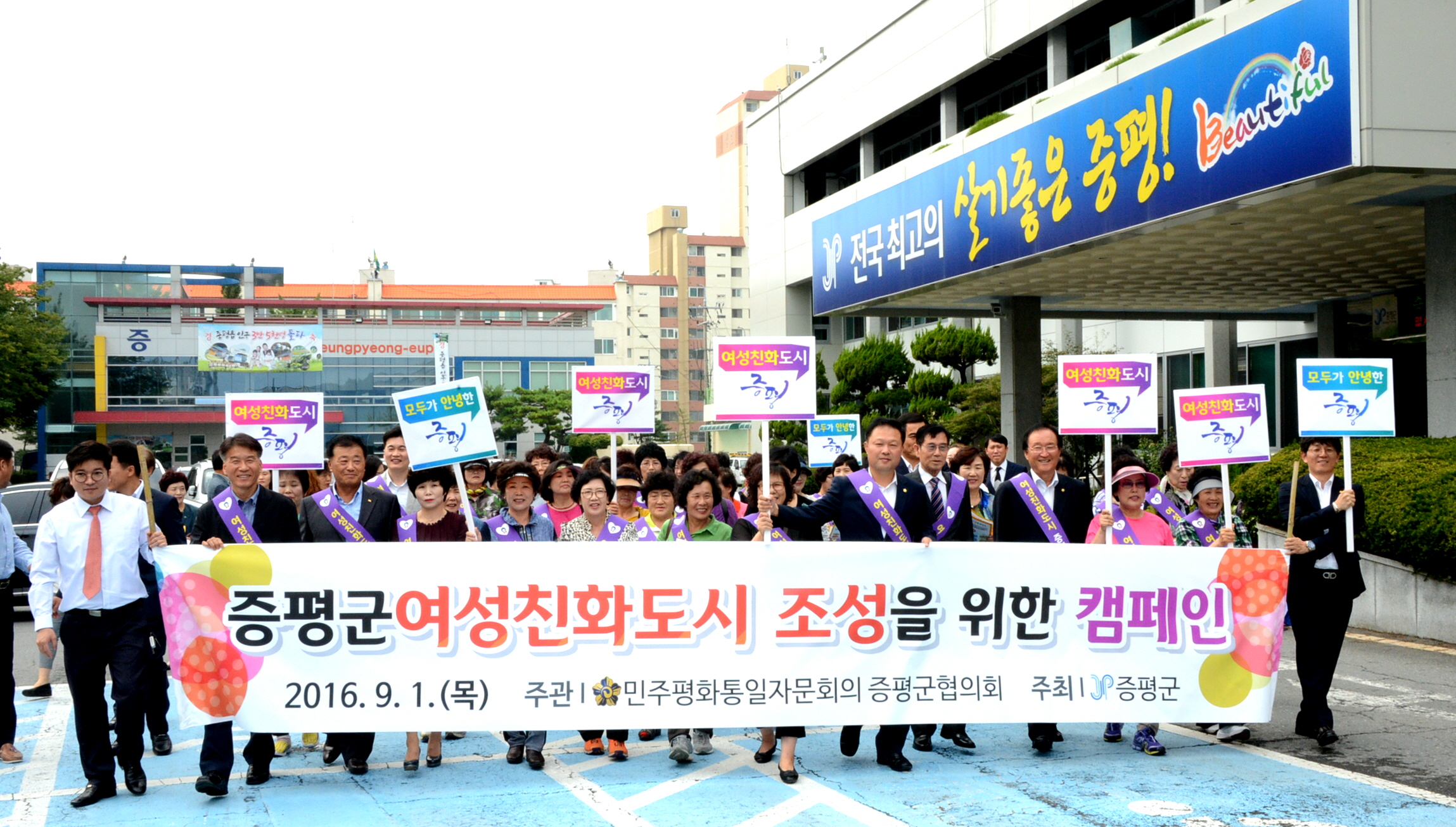 증평군은 1일 오전 11시 30분 증평군청 광장에서 홍성열군수, 강춘희 민주평통증평군협의회장을 비롯해 여성단체협의회원 등 50여명이 참석한 가운데 여성친화도시 분위기 조성을 위한 캠페인을 실시했다.(보도자료실 침조)