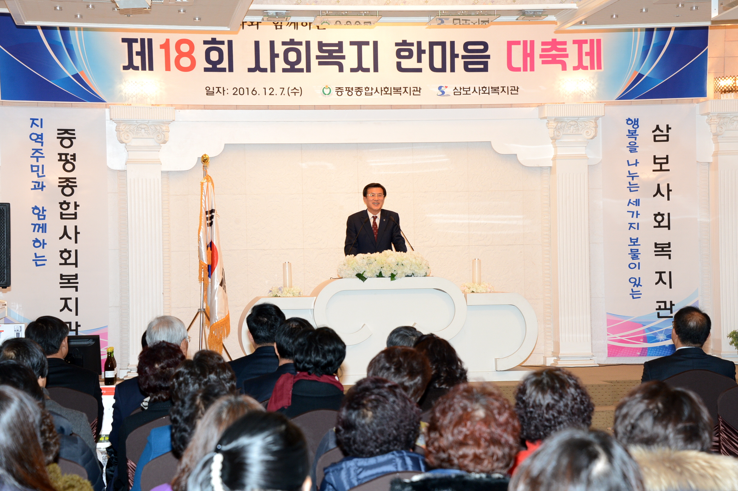 증평종합사회복지관(관장 양천공)과 삼보사회복지관(관장 이광훈)은 7일 증평 디펠리스웨딩홀에서 홍성열군수, 연종석 군의장을 비롯해 자원봉사자와 후원자 등 100여명이 참석한 가운데 제18회 사회복지 한마음대축제 행사를 개최했다.(보도자료실 참조)
