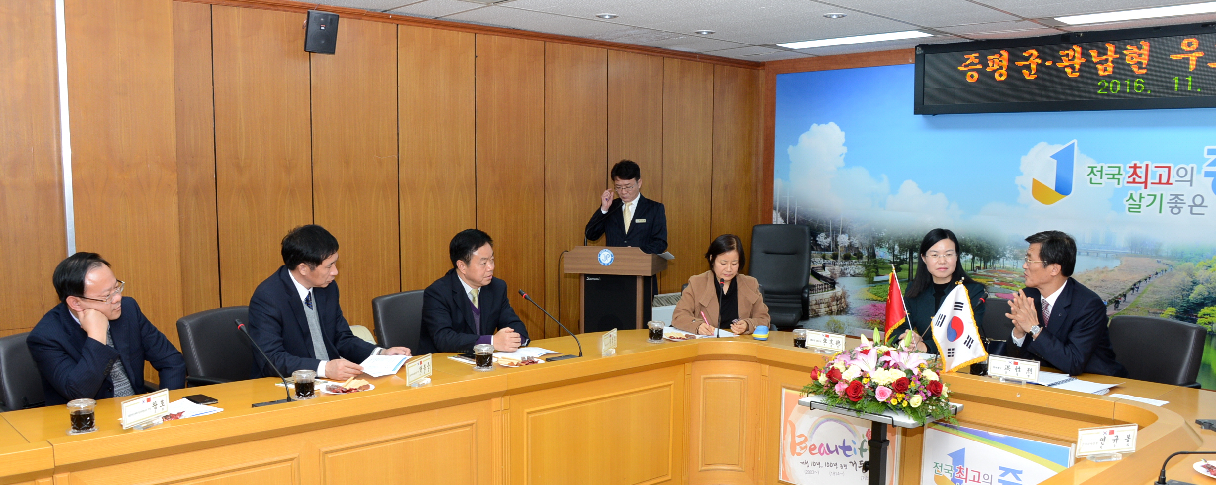 증평군과 우호교류 도시인 중국 강소성 관남현에서 장문염(張文艶) 부현장을 단장으로 하는 방문단 일행이 2박 3일간의 일정으로 지난 8일 증평군을 방문했다.(보도자료실 참조)