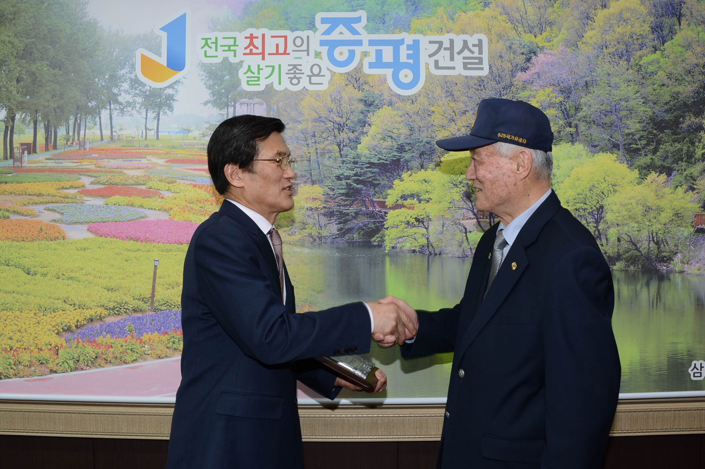 홍성열 증평군수가 21일 국가보훈시책 관심제고 및 참전유공자 존경과 예우 풍토조성에 공헌하여 대한민국 6·25참전유공자회(회장 박희모)로부터 감사패를 받았다.(보도자료실 참조)