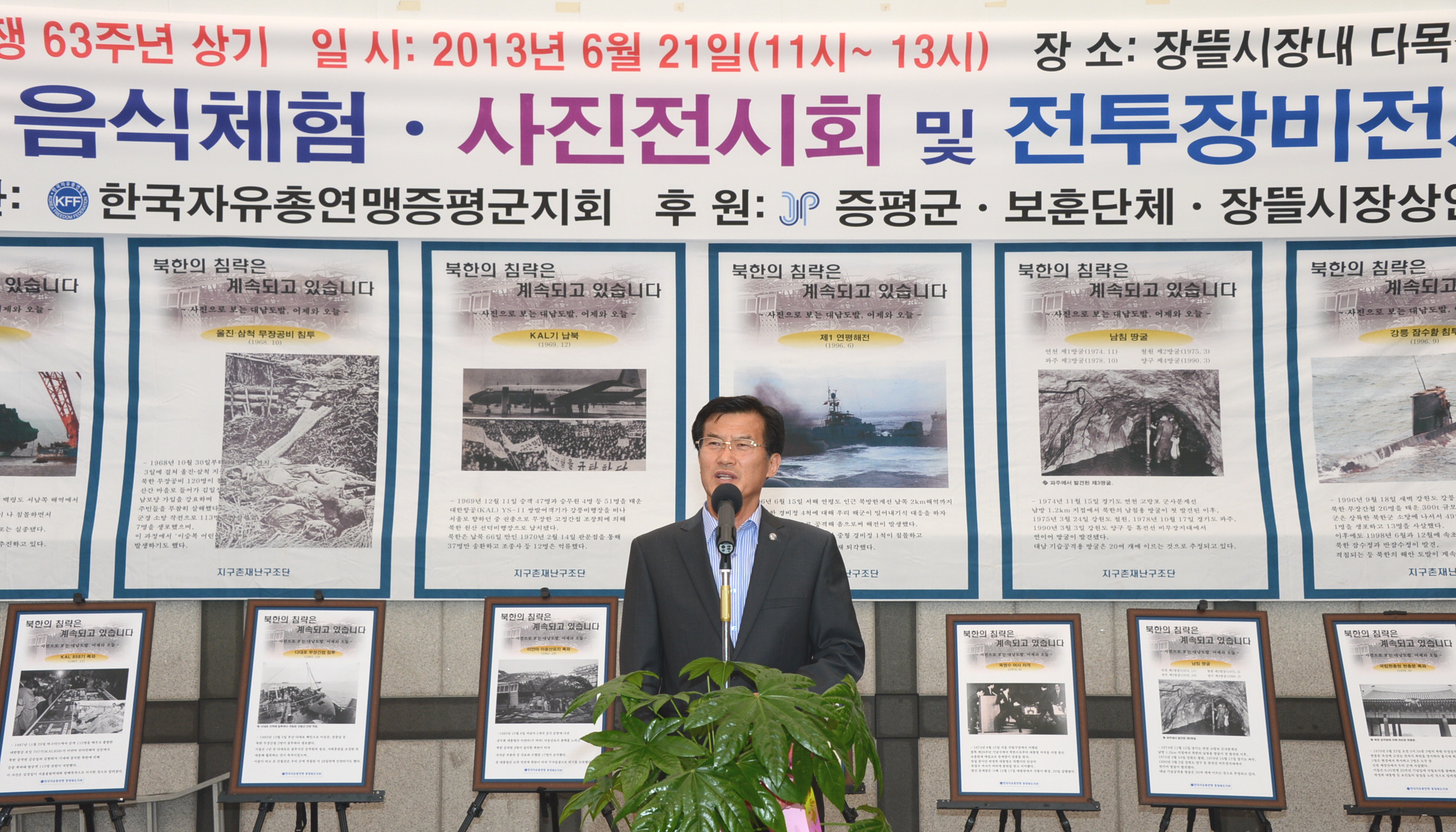 6·25 전쟁 63주년 및 호국보훈의 달 6월을 맞아 한국자유총연맹증평군지회(지회장 김덕중)에서는 21일 오전11시부터 증평장뜰시장 다목적광장에서 ‘6·25 음식체험 및 사진·전투장비전시회’를 열었다. [보도자료실 참조]