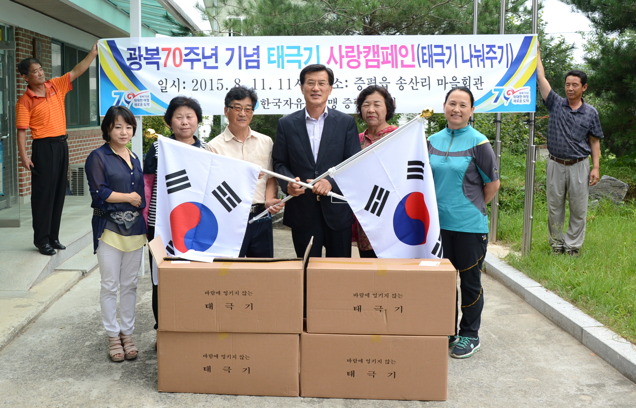 한국자유총연맹증평군지회(정태욱 회장)는 11일 오전 11시 정태욱 회장을 비롯해 회원 등 15명이 참석한 가운데 광복 70주년을 맞아 증평읍 송산1리(김용호 이장)와 도안면 화성3리(연풍희 이장)에 태극기 200여개를 나눠주는‘태극기 사랑 캠페인’을 실시했다.(보도자료실 참조)