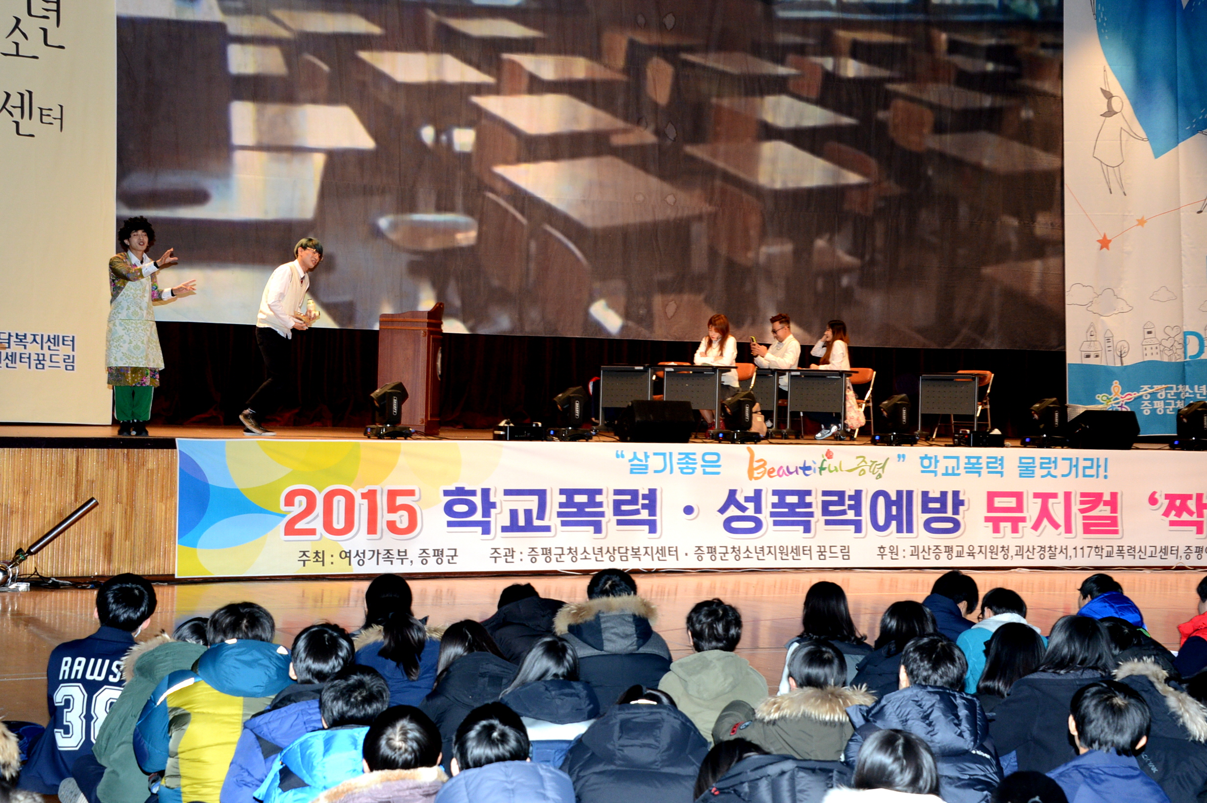 증평군청소년상담복지센터와 증평군청소년지원센터 꿈드림(센터장 김병노)은 17일 오후 2시부터 증평스포스센터에서 학교폭력(성폭력) 예방에 대한 뮤지컬 공연(힐링 뮤지컬 짝꿍) 및 체험부스를 운영했다. (보도자료실 참조)