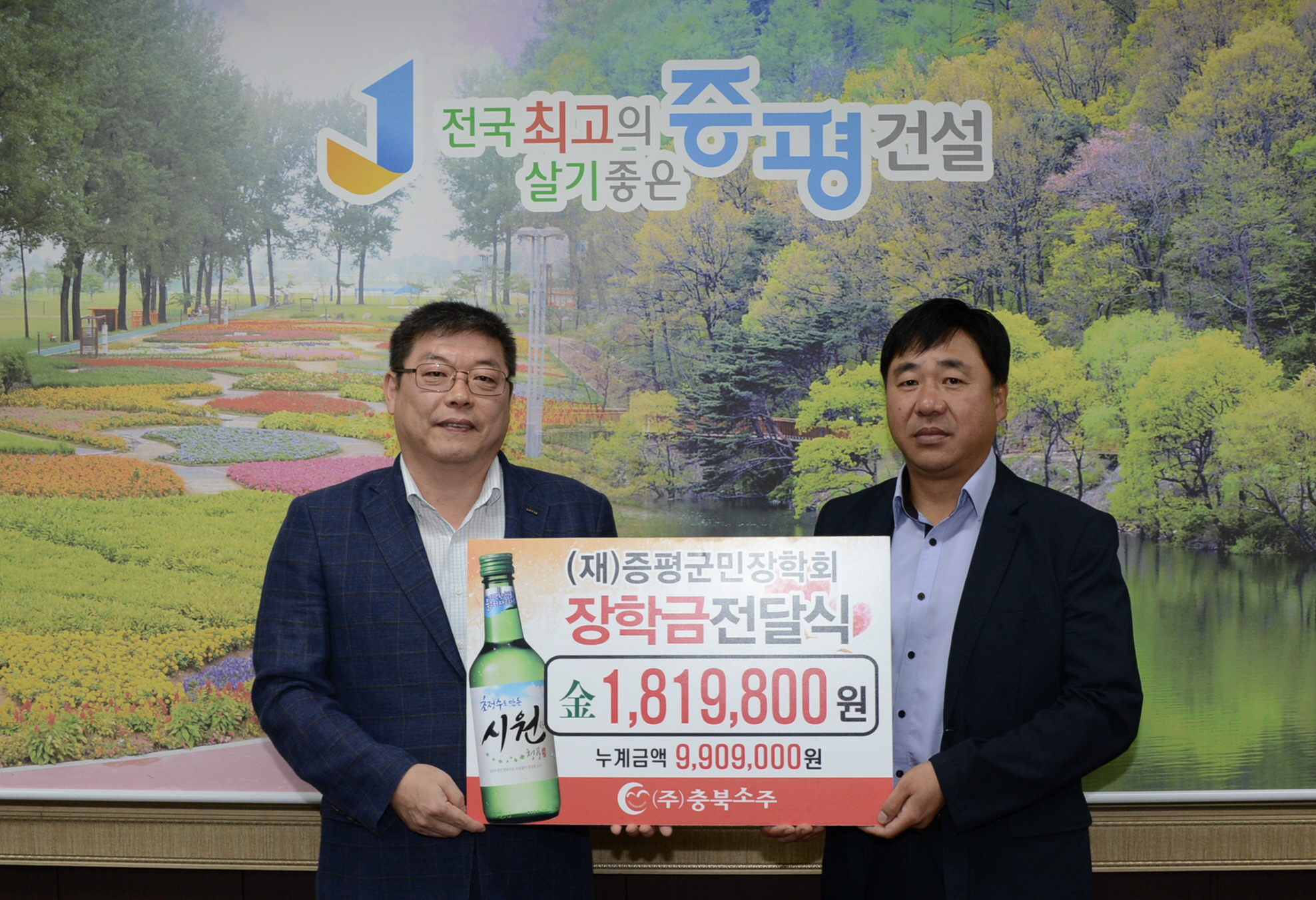 (주)충북소주(대표이사 이재혁)에서 26일 증평군청을 방문하여 (재)증평군민장학회(이사장 홍성열 증평군수)에 장학사업을 위한 장학기금 1,819,800원을 기탁했다.(보도자료실 참조)