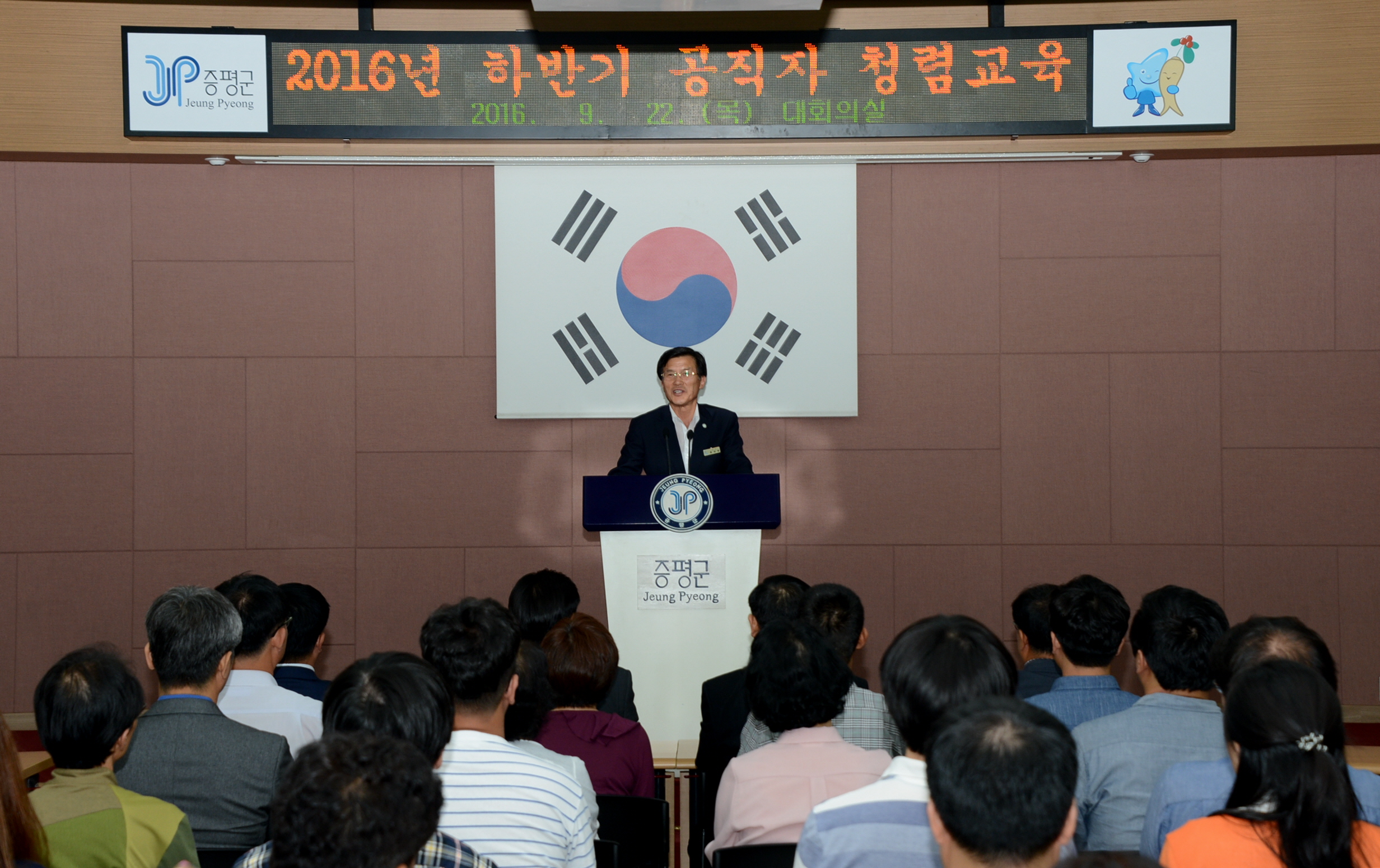 증평군은 청탁금지법(일명 김영란법)의 본격적인 시행(9월 28일)에 앞서 22일 오후 4시 군청 대회의실에서 공무원 200여명이 참석한 가운데 청렴교육을 실시했다.[보도자료실 참조]