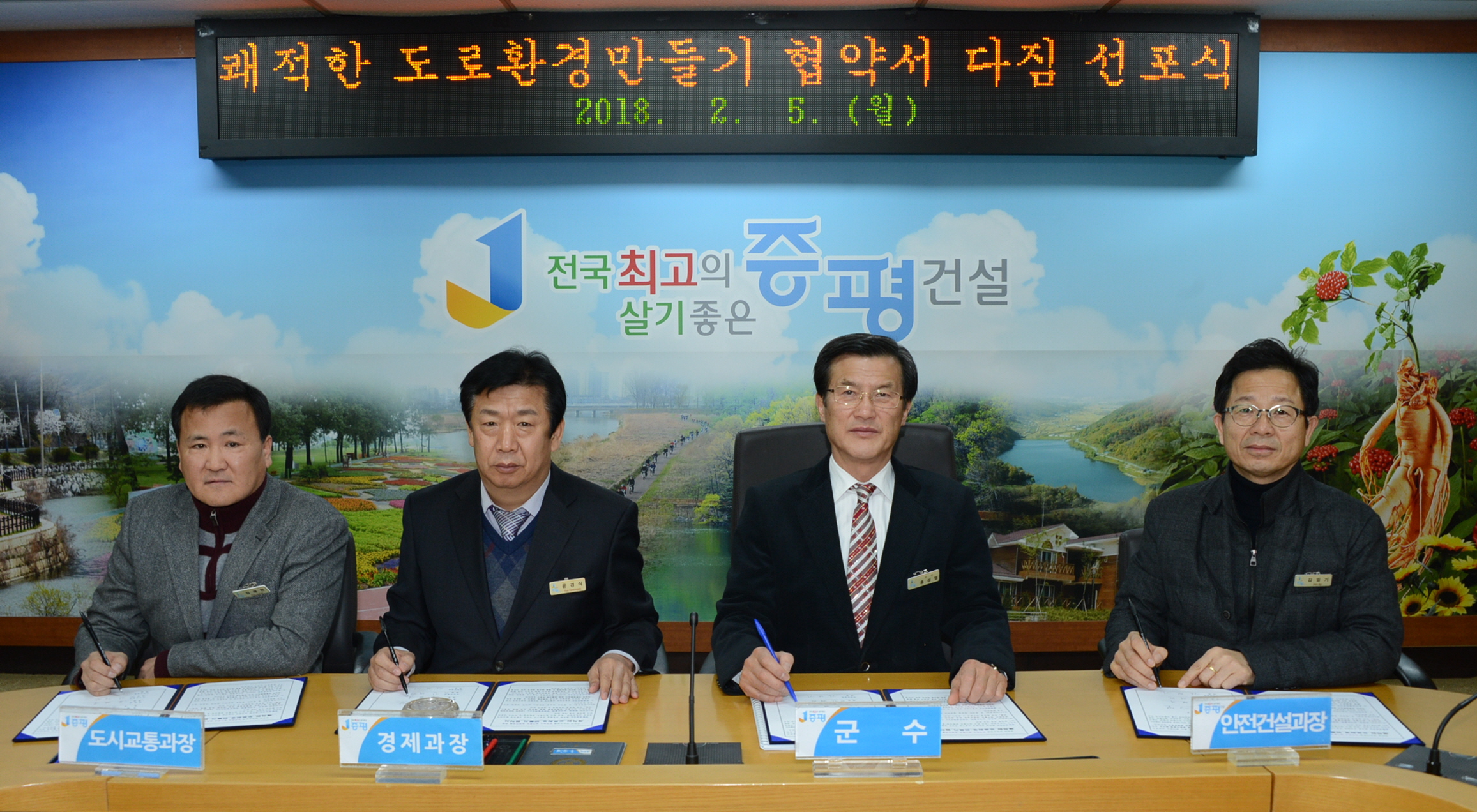 증평군은 5일 군청 소회의실에서 주무부서인 안전건설과와 사업부서인 경제과, 도시교통과 간에 ‘쾌적한 도로환경 만들기’ 협약을 체결하고 깨끗한 도로환경 조성을 위해 힘을 모으기로 했다.[보도자료실 참조]