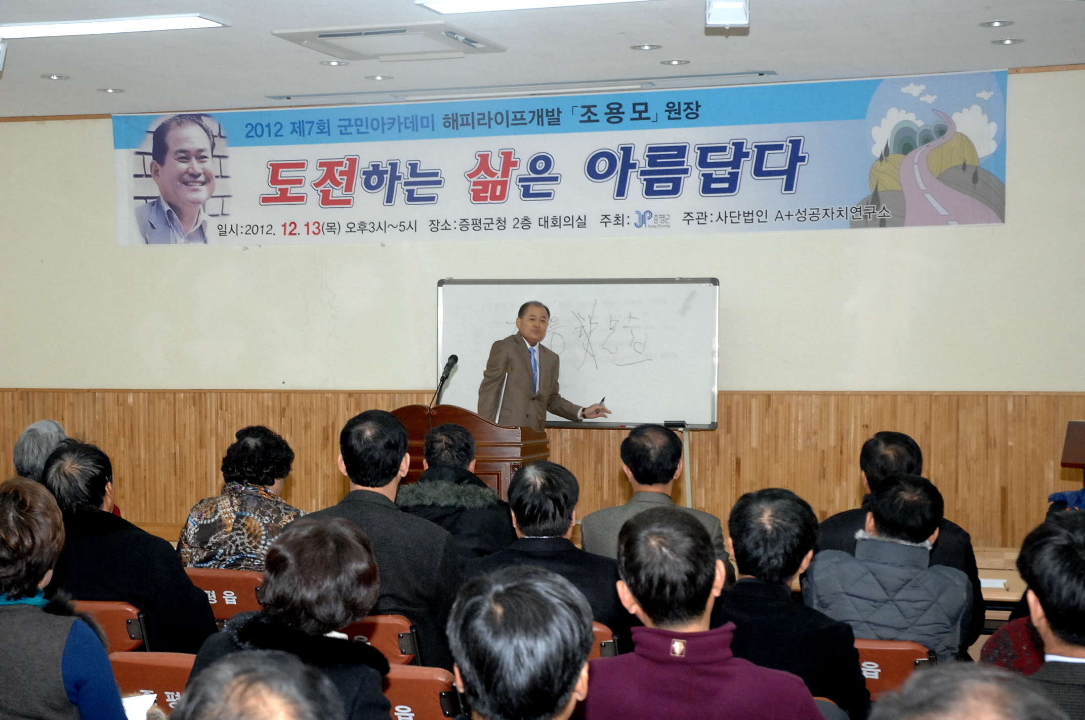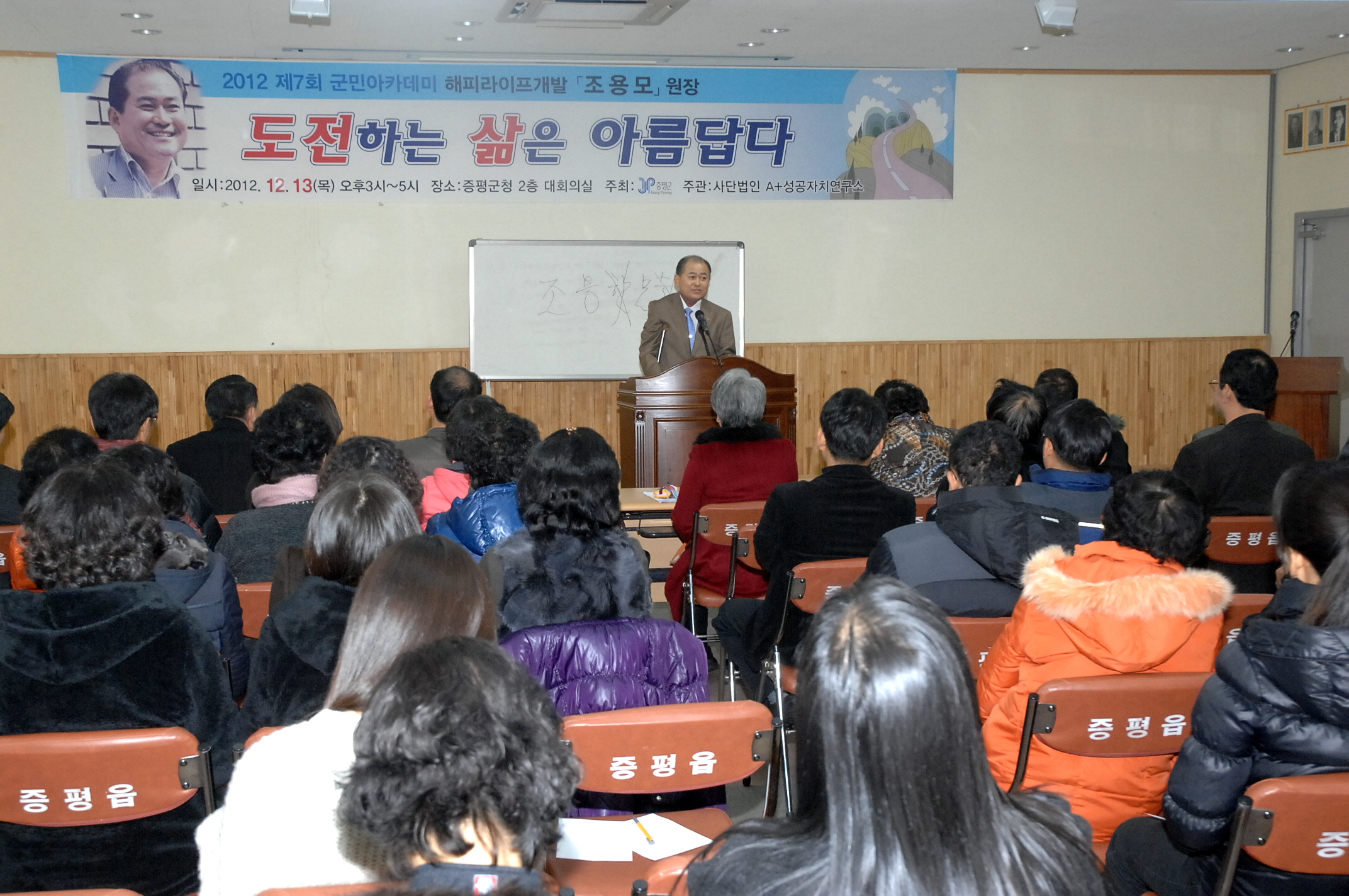 증평군은 13일 오후 3시 증평읍사무소 2층 회의실에서 군민 아카데미 일곱번째 강연으로 보험업계에서 ‘외다리 세일즈왕’으로 통하는 해피라이프 개발원 조용모 원장을 초청해 ‘도전하는 삶은 아름답다’라는 주제로 특강을 개최했다. [12월6일 보도자료 참조]