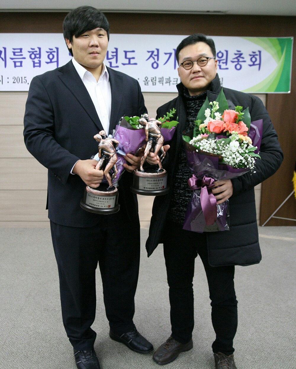 증평군청인삼씨름단 김진 선수가 지난 20일 대한씨름협회로부터 2014년도 지역장사씨름대회 부문 최우수선수상과 정규대회 일반부 우수선수상을 수상했다. [증평보도자료실 참조]