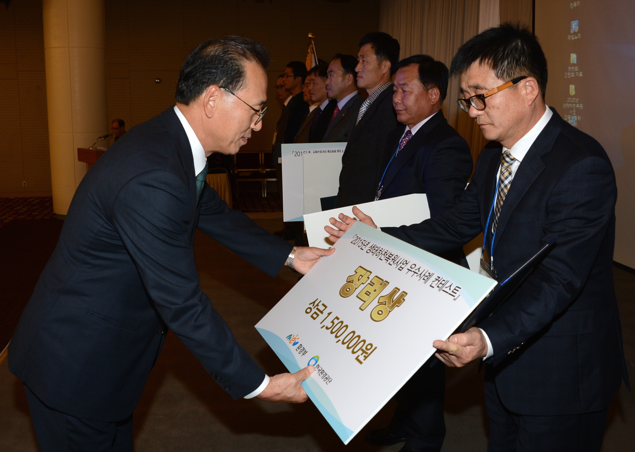 증평군이 환경부가 전국 지자체를 대상으로 실시하는 ‘생태하천 복원사업’ 종합 평가에서 장려상을 받았다.(사진은 민광준환경과장(사진 오른쪽)이 환경관리공단 이사장으로부터 표창패와 시상금을 받는 모습.보도자료실 참조)