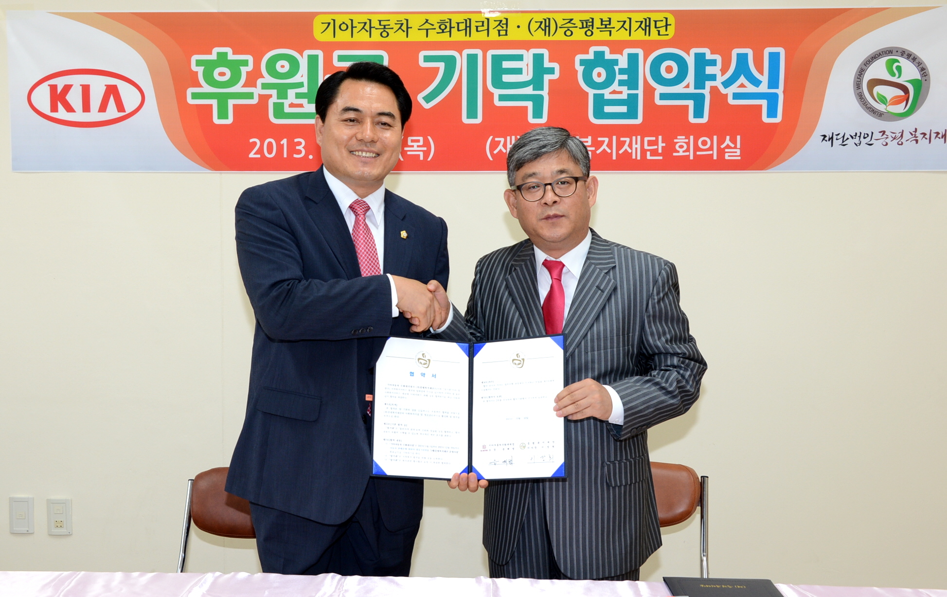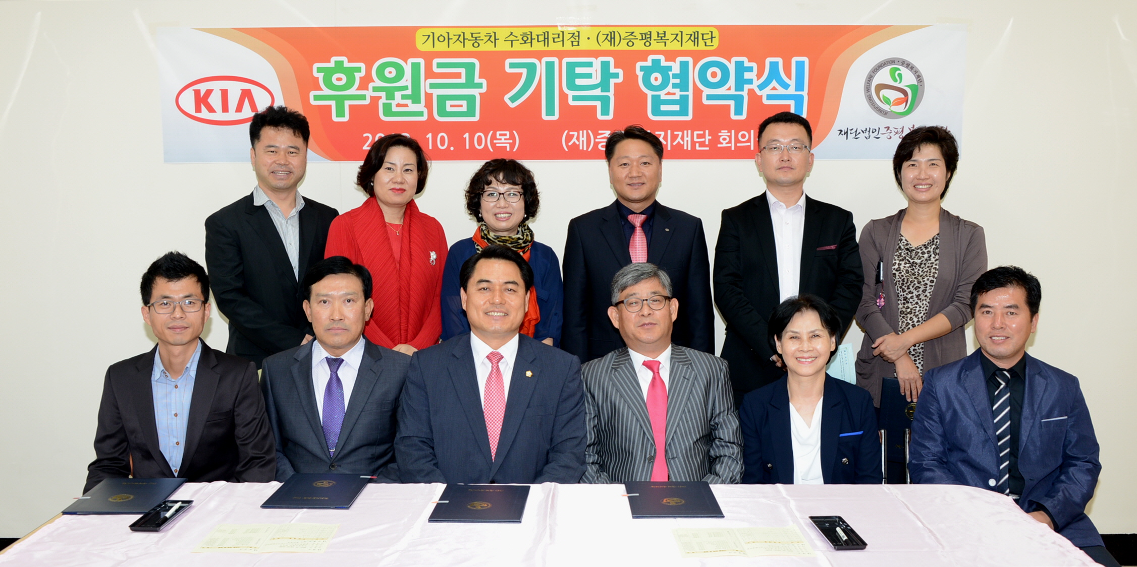 (재)증평복지재단(이사장 이장희)과 기아자동차 수화대리점(소장 윤해명)이 지역복지서비스 발전과 지역의 질 높은 사회복지서비스를 위한 후원금 기탁 협약식을 11일 체결했다. [보도자료실 참조]