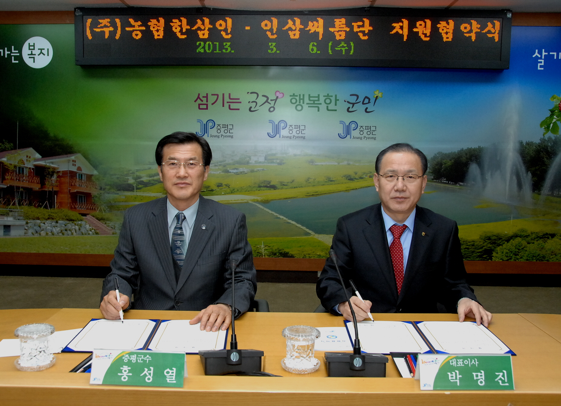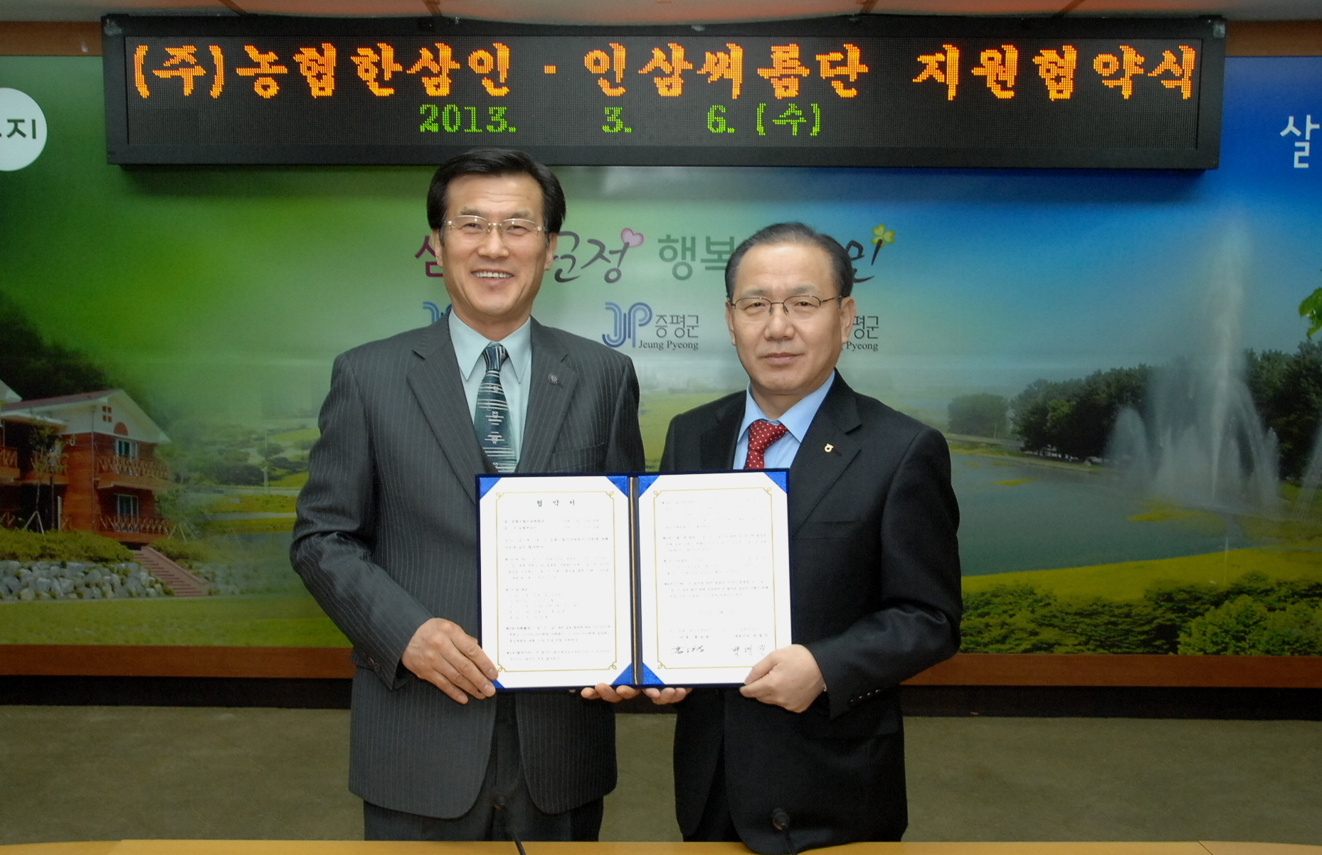 증평군청 인삼씨름단과 (주)농협한삼인은 6일 오전 10시 증평군청 소회의실에서 5,000만원 상당의 후원금 및 홍삼제품을 지원하는 지원협약을 체결했다. [보도자료실 참조]