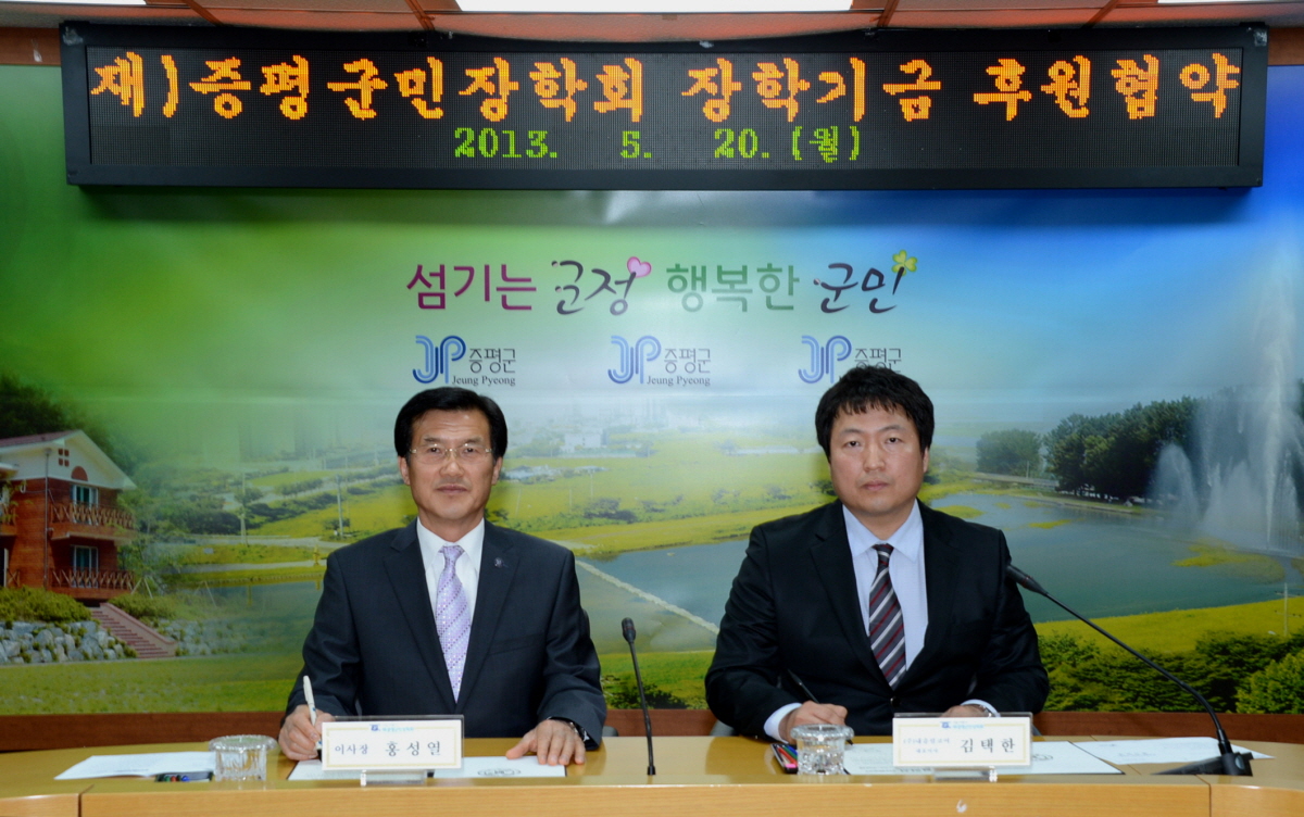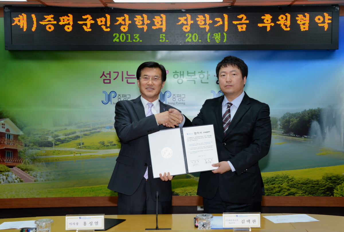 (주)내츄럴코어(김택한 대표이사)는 21일 군청 소회의실에서 (재)증평군민장학회(홍성열 이사장)와 장학기금 후원 협약을 체결했다. [5월22일 보도자료 참조]