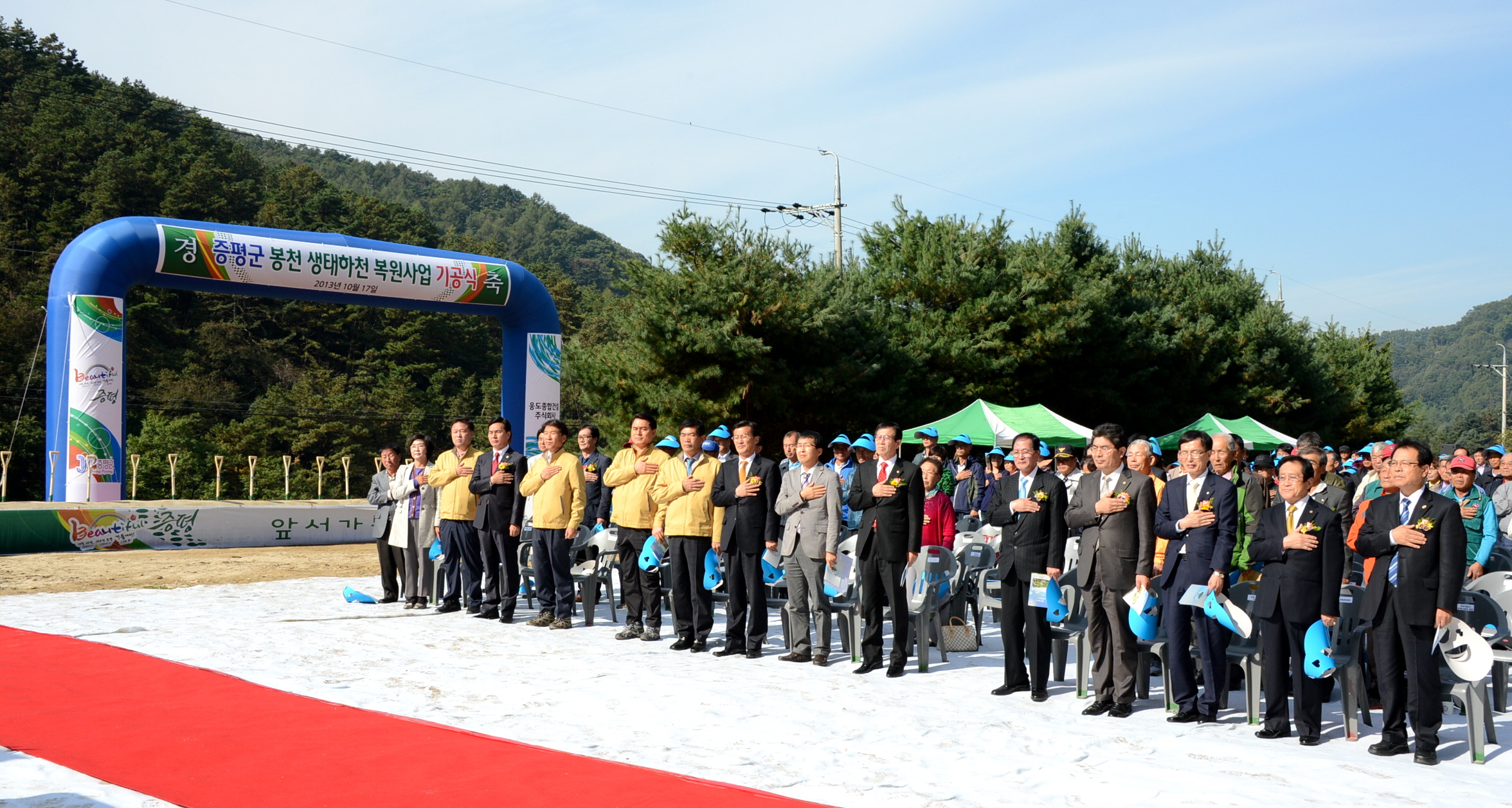 증평군은 17일 오전 10시 증평읍 율리 337번지에서 홍성열 증평군수를 비롯해 증평군의회 박석규 의장과 군의원 및 각 기관단체장, 감리사대표, 시공사대표, 지역주민 등 150여명이 참석한 가운데 ‘봉천 생태하천 복원사업 기공식’을 가졌다. [보도자료실 참조]