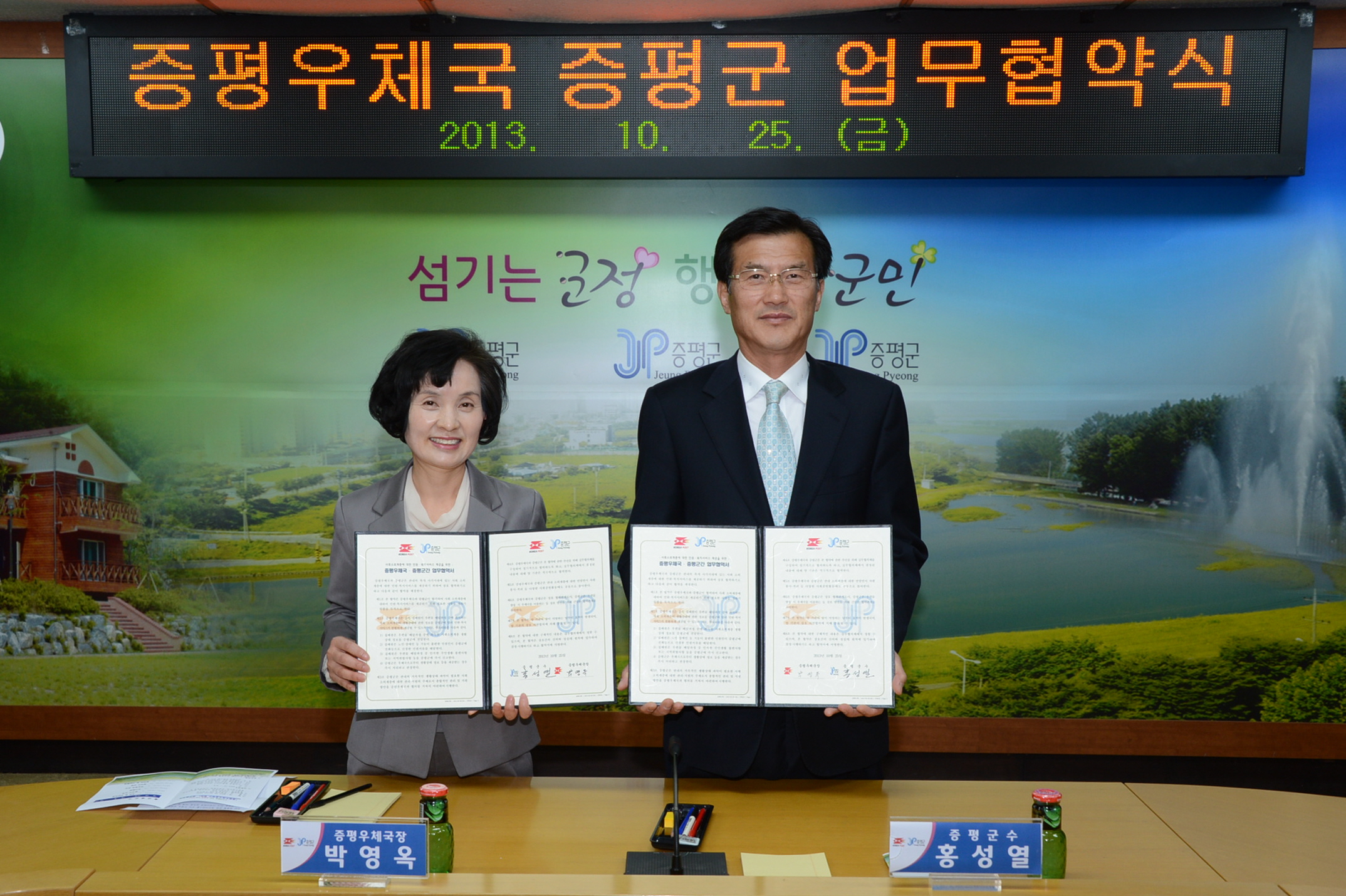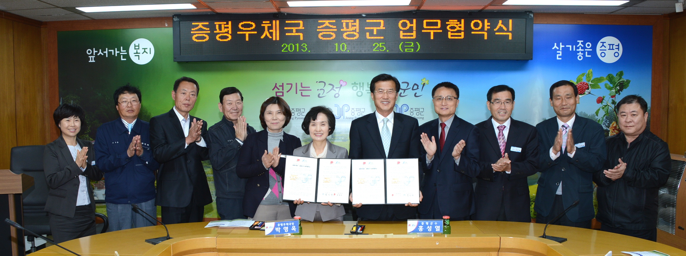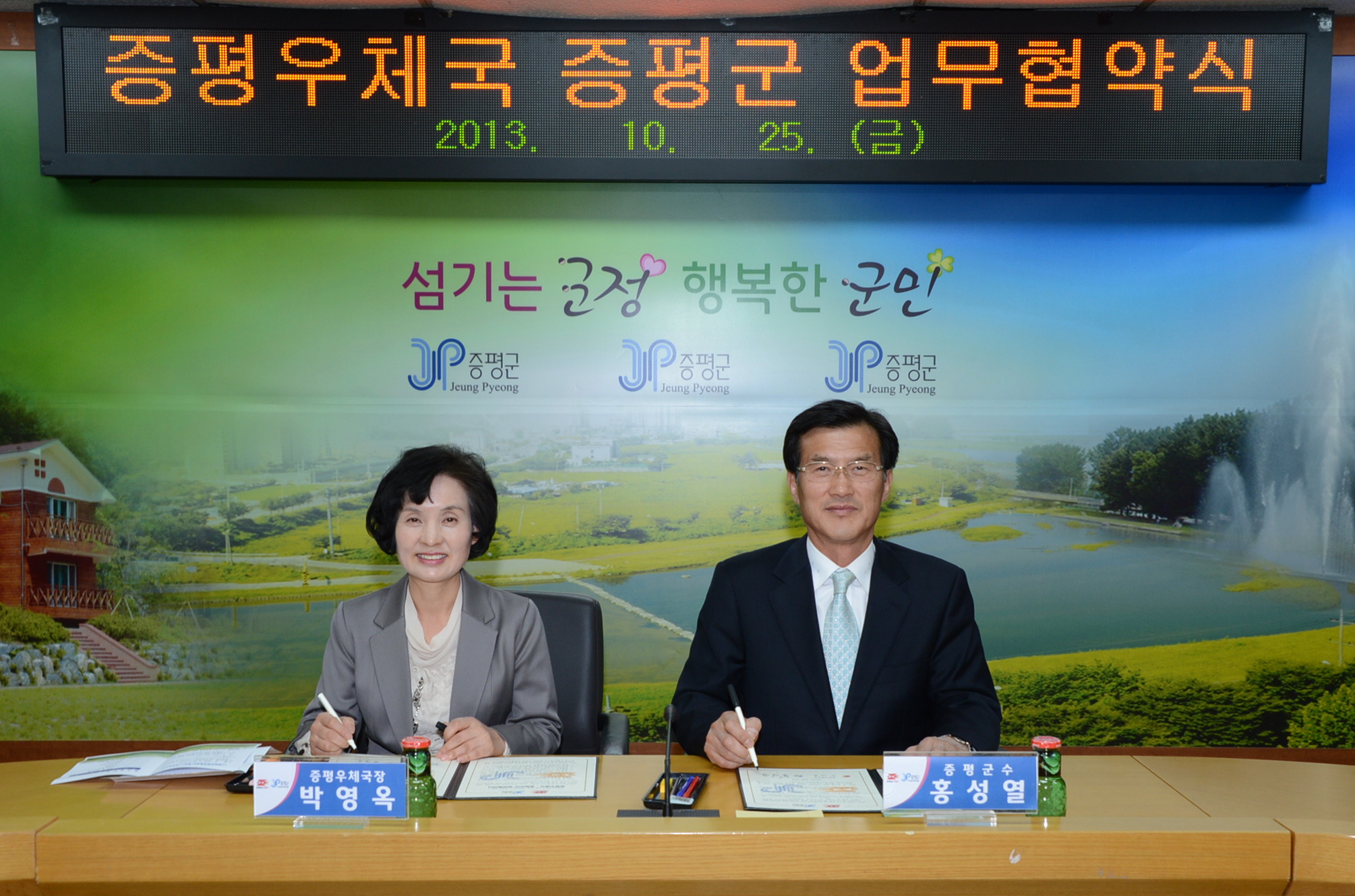 홍성열 증평군수와 박영옥 증평우체국장은 25일 오후3시 군청 소회의실에서 직원 및 집배원 등 20여명이 참석한 가운데 지역내 소외계층에 대한 민원·복지서비스 제공을 위한 ‘행복배달 빨간자전거 업무협약’을 체결했다. [보도자료실 참조]