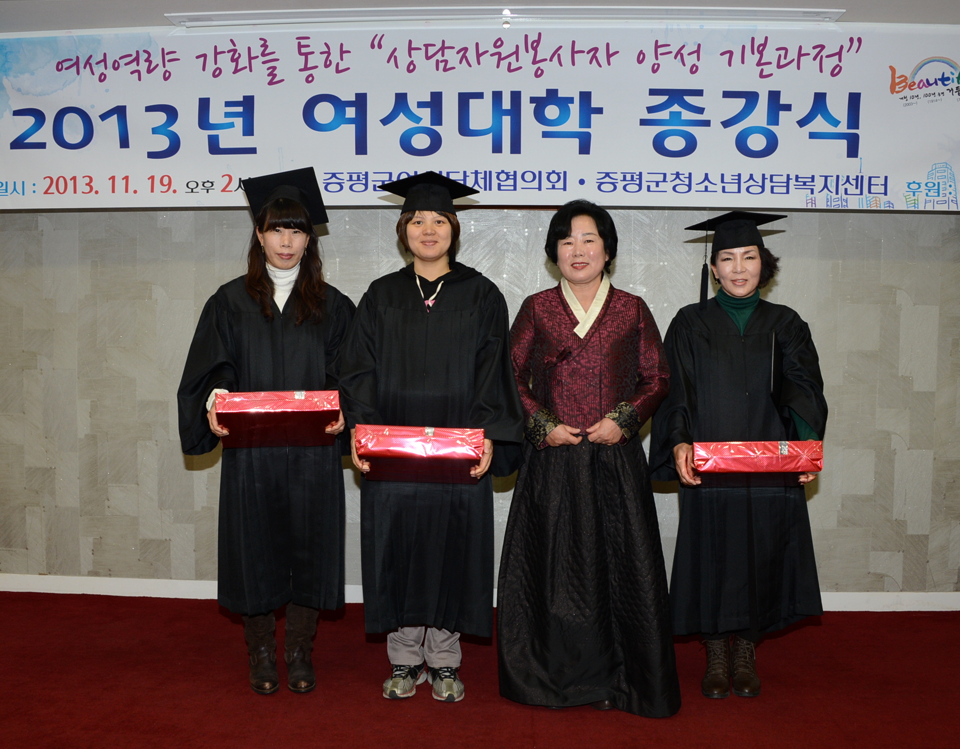 증평군은 19일 오후2시 여성회관에서 홍성열 증평군수, 박석규 군의장 등 지역인사, 증평군여성단체협의회원 및 수료생 등 50여명이 참석한 가운데 ‘2013년 제9기 증평군 여성대학’ 종강식을 개최했다. [보도자료실 참조]