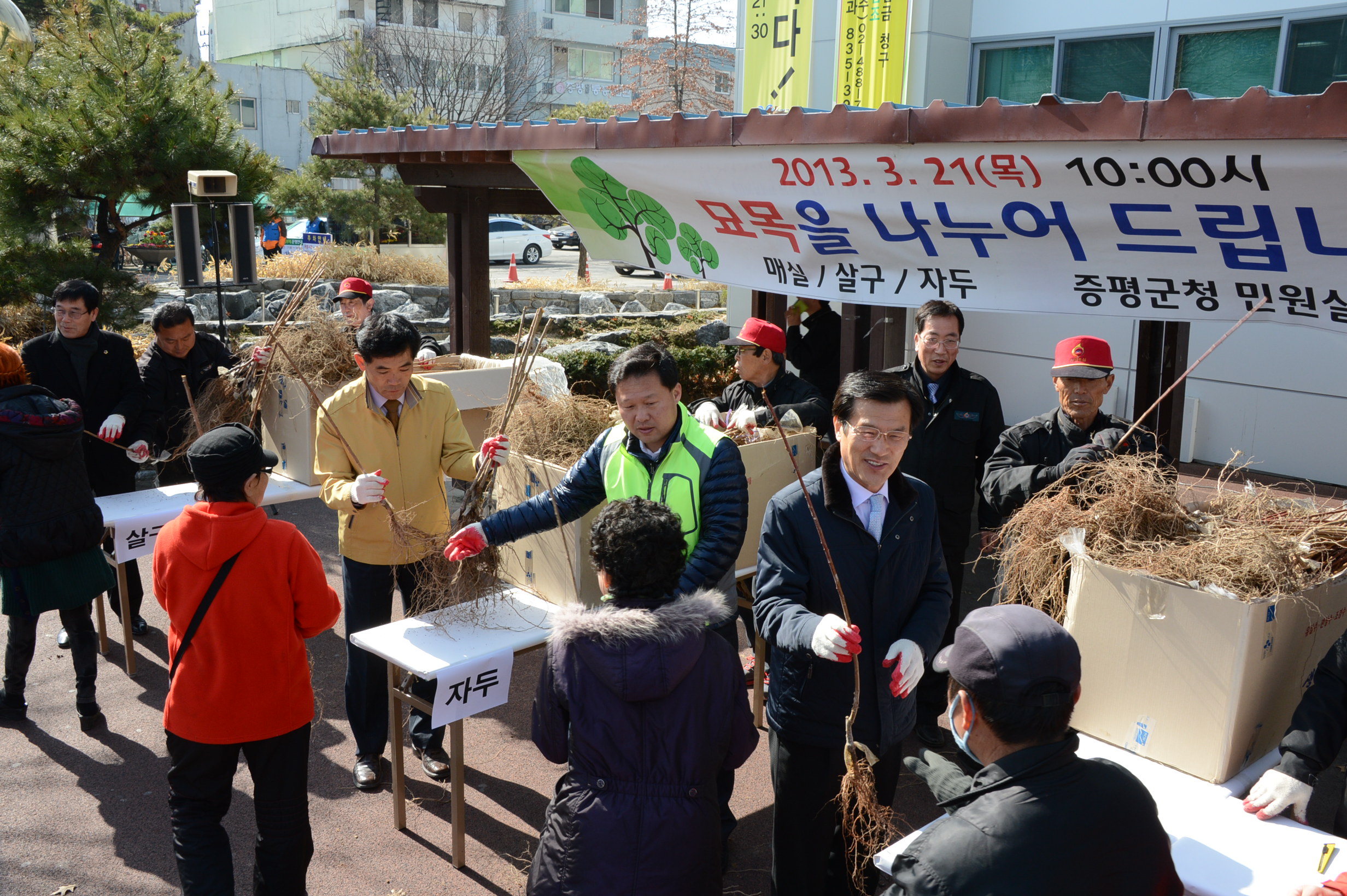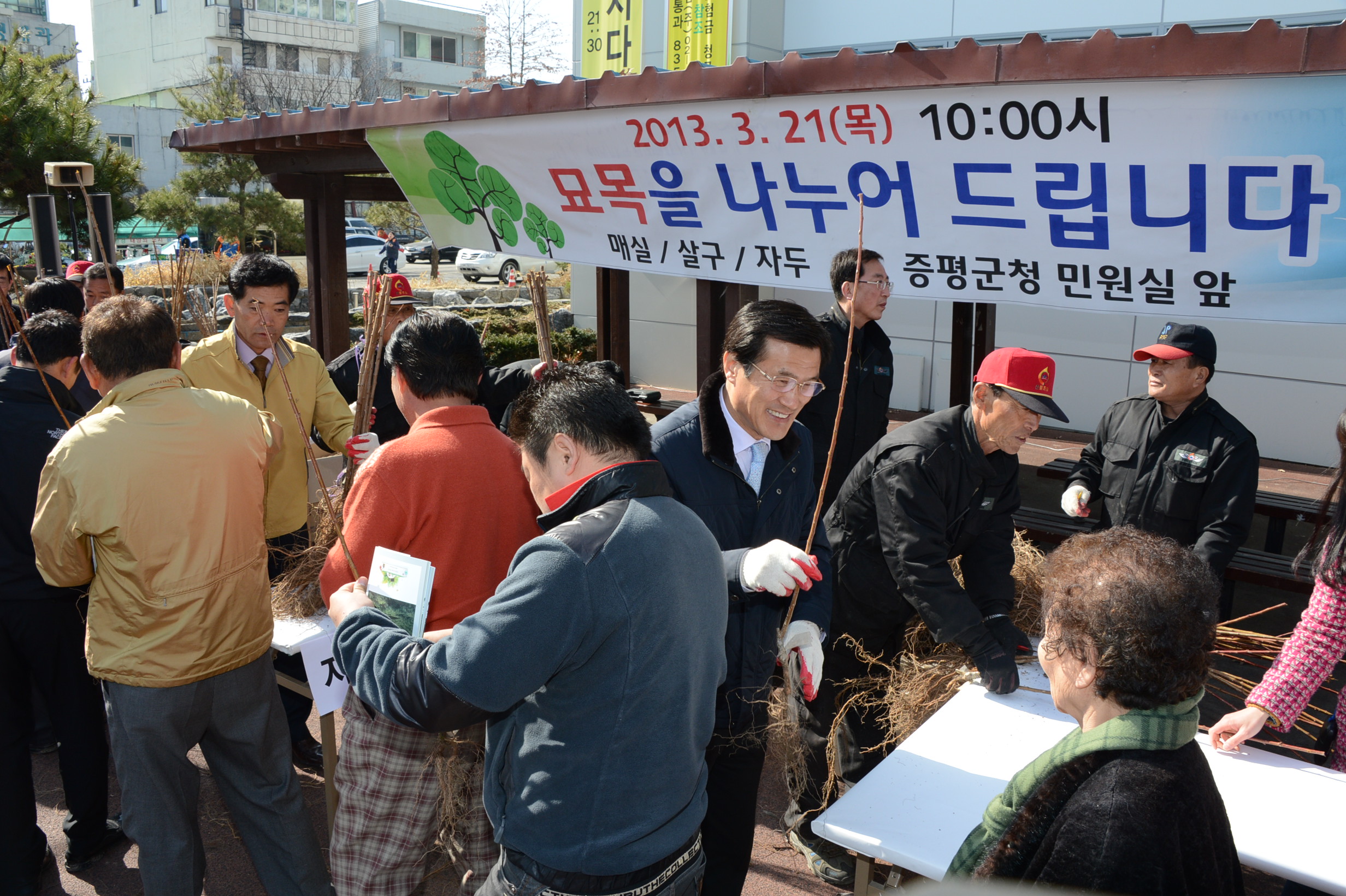 증평군은 제68회 식목일을 기념하고 ‘내나무갖기 캠페인’의 일원으로 21일 오전 10시 군청 민원실 앞에서 홍성열 증평군수, 박석규 군의장, 김봉회 도의원 등이 참여한 가운데 나무 나누어주기 행사를 가졌다. [보도자료실 참조]