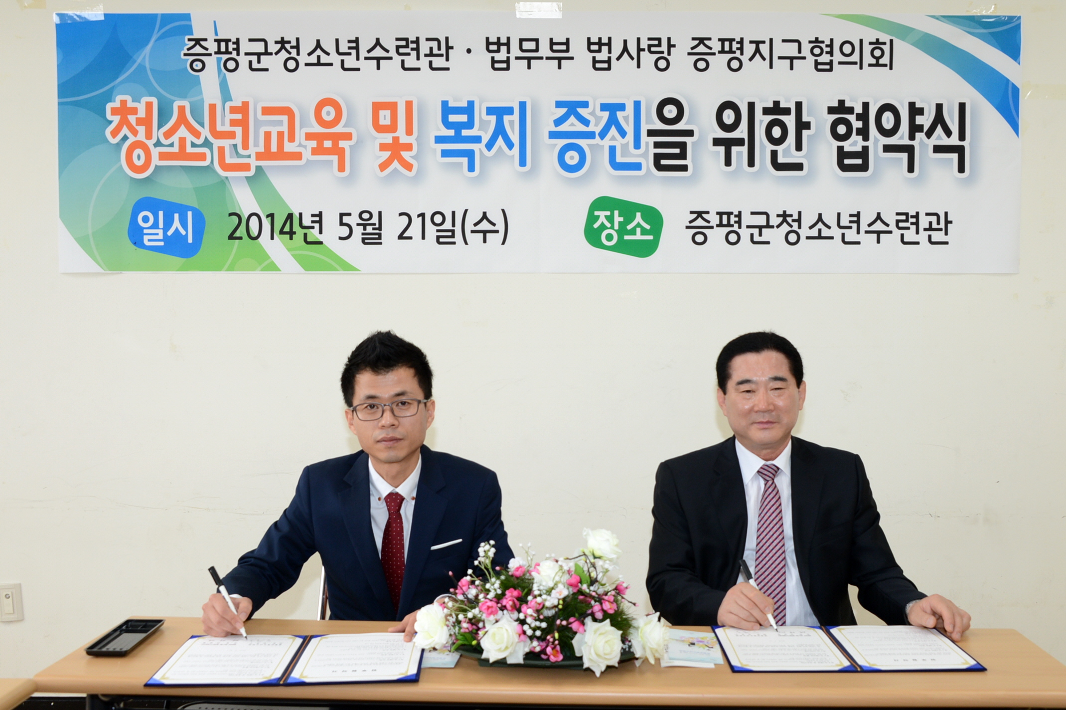 증평군청소년수련관(관장 강경구)과 법무부산하 법사랑증평지구협의회(회장 연광영)는 21일 증평군 청소년수련관에서 청소년교육 및 복지 증진 후원을 위한 협약식을 체결했다. [보도자료실 참조]