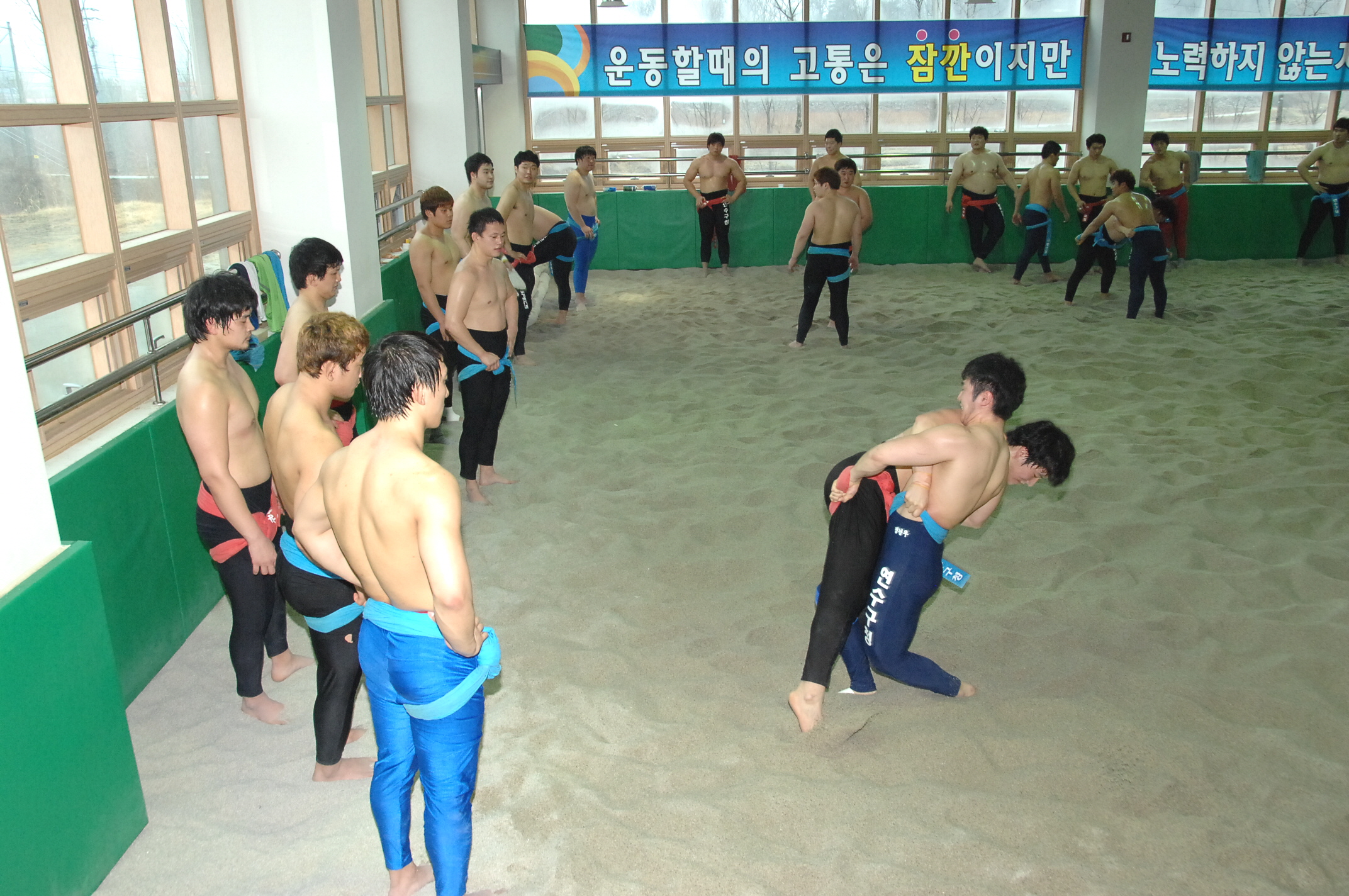 증평군 증평읍 송산리에 위치한 증평군씨름장이 동절기 전지훈련팀들의 씨름열기로 한 겨울 추위를 녹이고 있다.[보도자료실 참조]