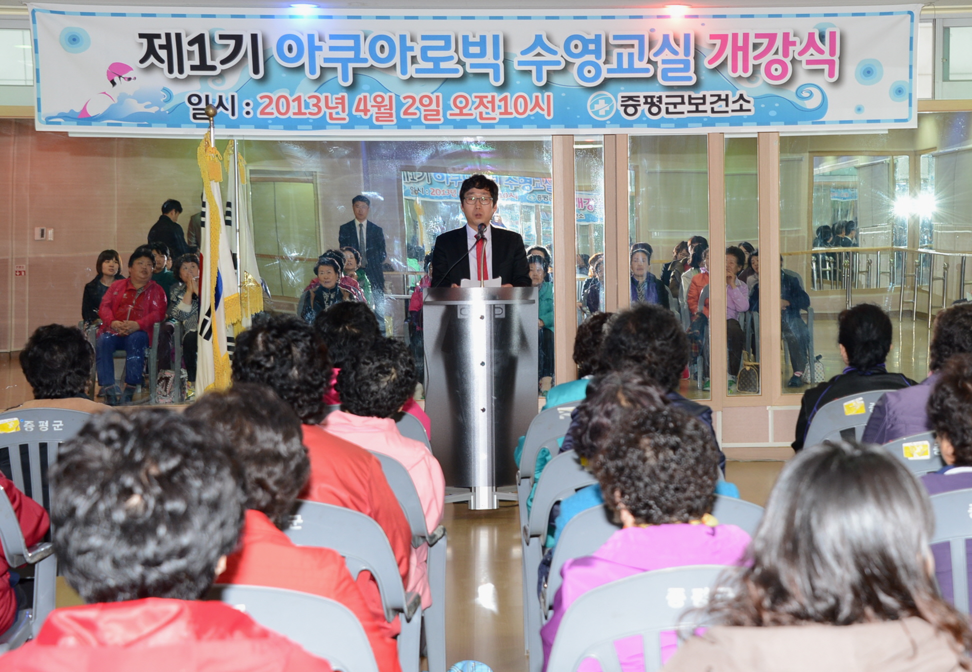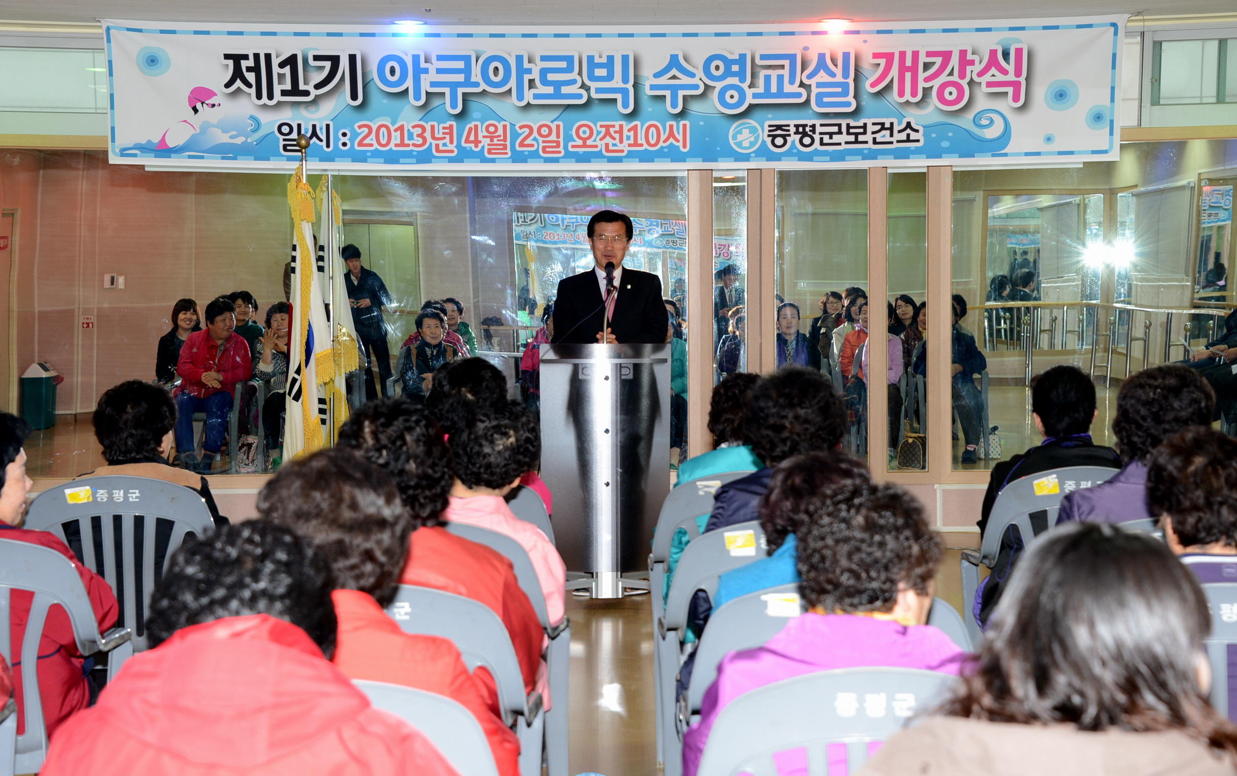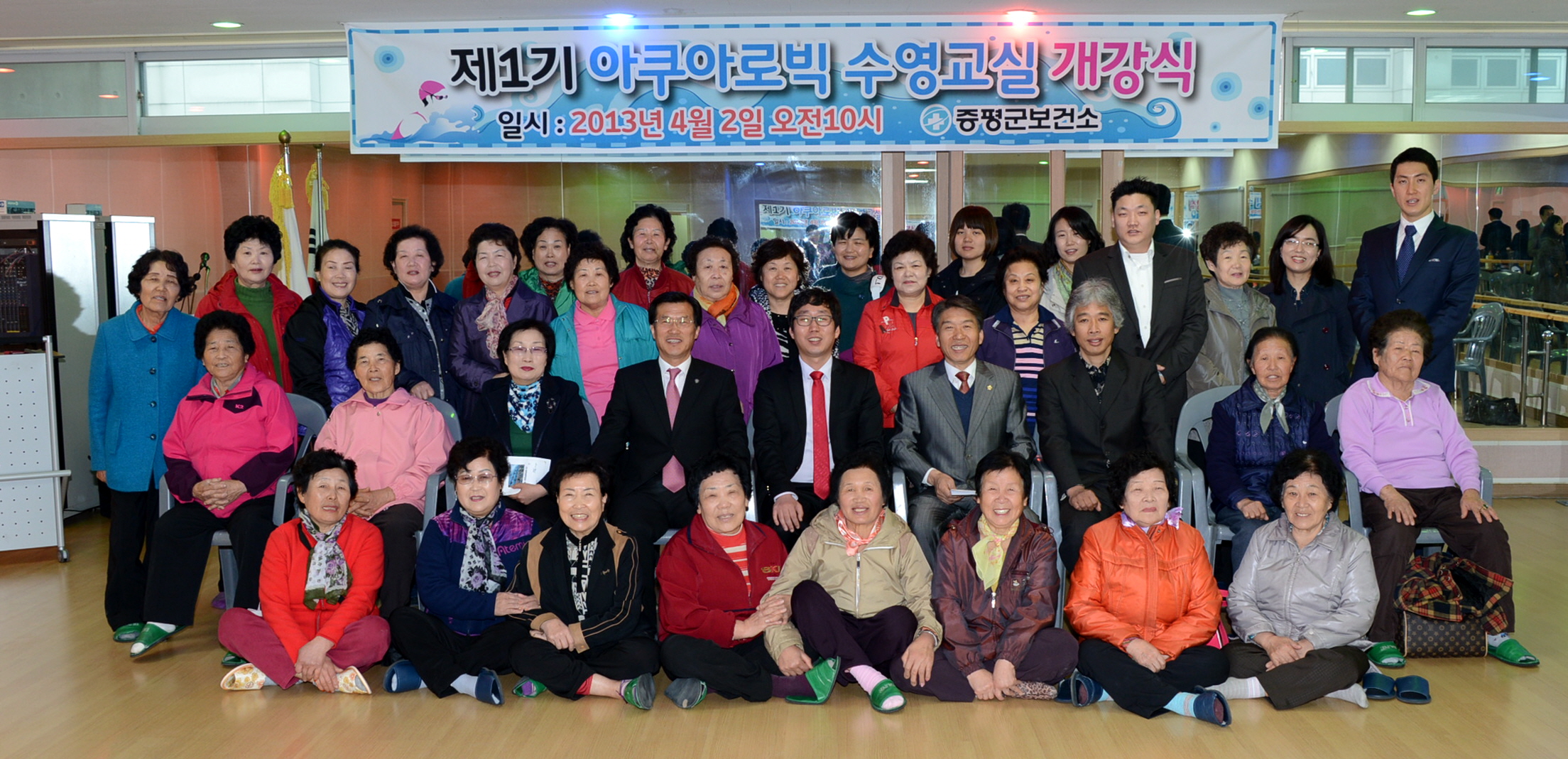 증평군보건소는 2일 오전 증평국민체육센터에서 수강자 및 관계자 50여명이 참석한 가운데 제1기 아쿠아로빅수영교실 개강식을 가졌다. [보도자료실 참조]