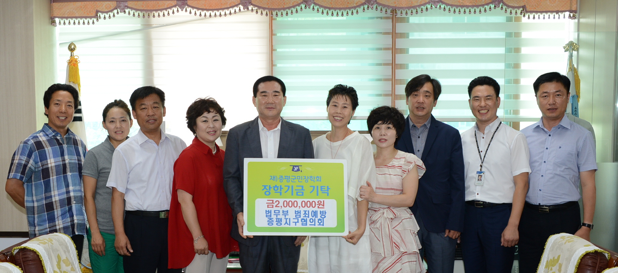 법무부 범죄예방 증평지구협의회(회장 연광영)에서 증평군의 미래를 이끌어 나갈 지역인재양성을 위해 써달라며 지난 22일 재)증평군민장학회(이사장 홍성열)에 2백만원을 장학기금으로 기탁했다. [보도자료실 참조]