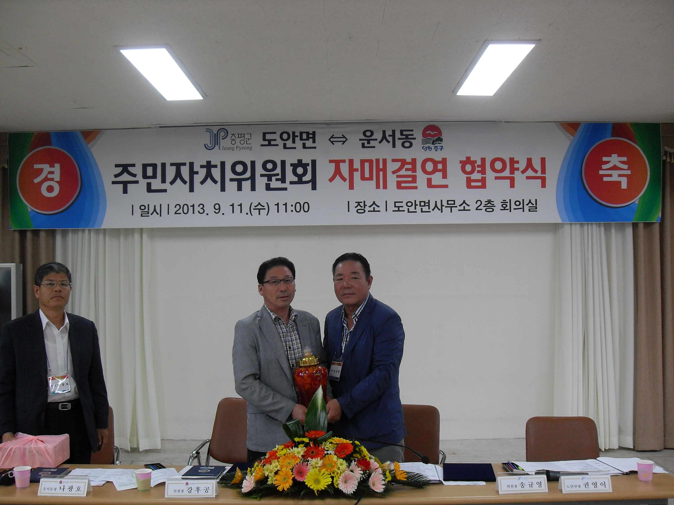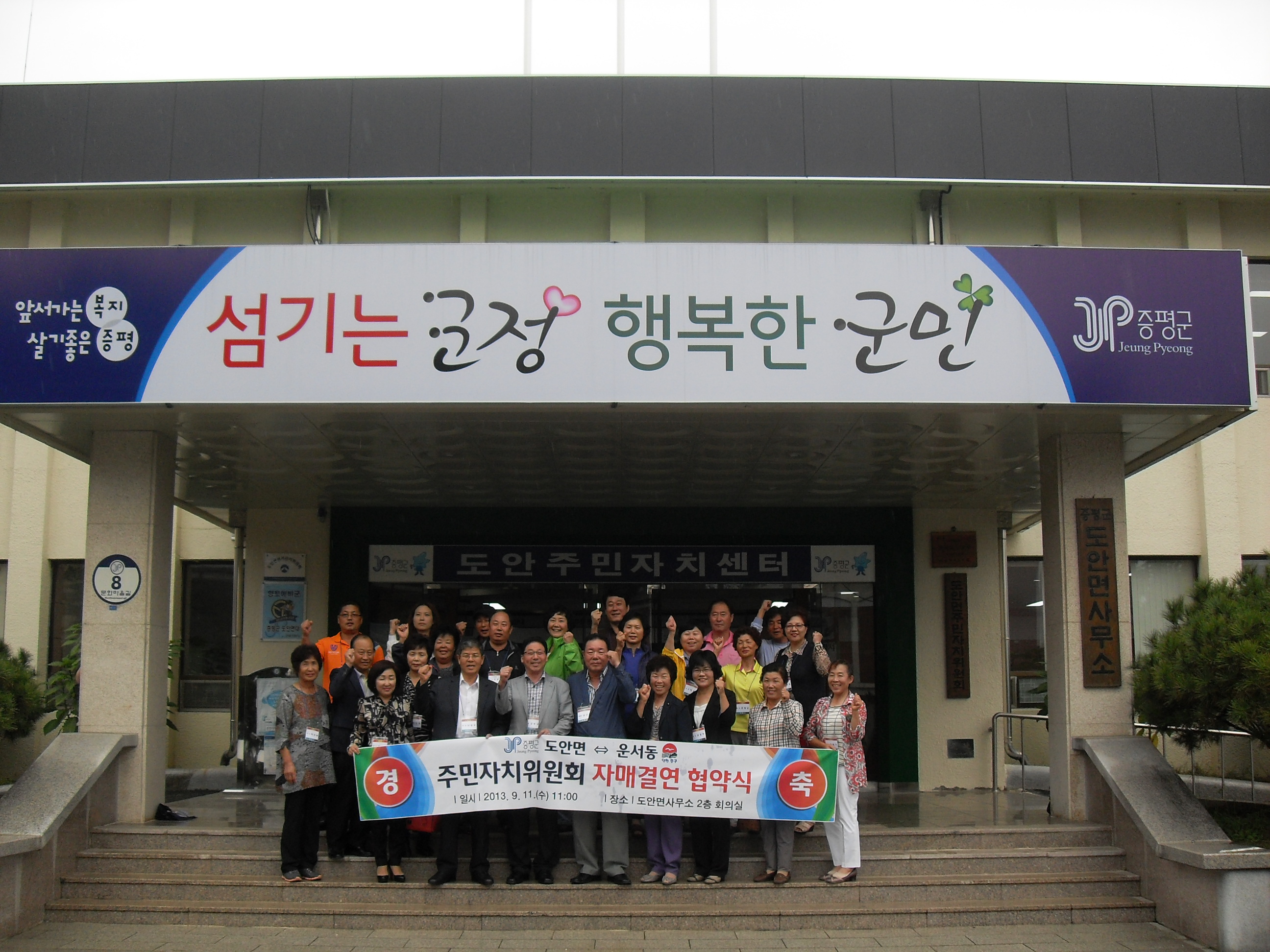 증평군 도안면 주민자치위원회(위원장 송규영)는 11일 오전 11시 도안면사무소에서 인천 중구 운서동 주민자치위원회(위원장 강후공)와 도안면사무소에서 자매결연 협약을 체결했다. [증평보도자료실 참조]