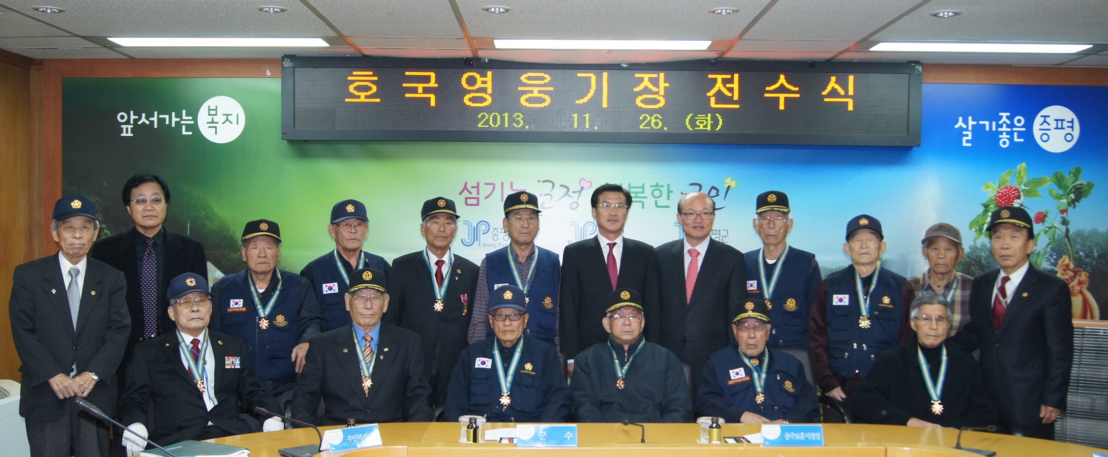 증평군은 26일 군청 소회의실에서 홍성열 증평군수, 박희철 충주보훈지청장, 지역보훈단체장 등이 참석한 가운데 6.25참전유공자 14명에게 호국영웅기장을 전수하는 행사를 가졌다. [증평보도자료실 참조]