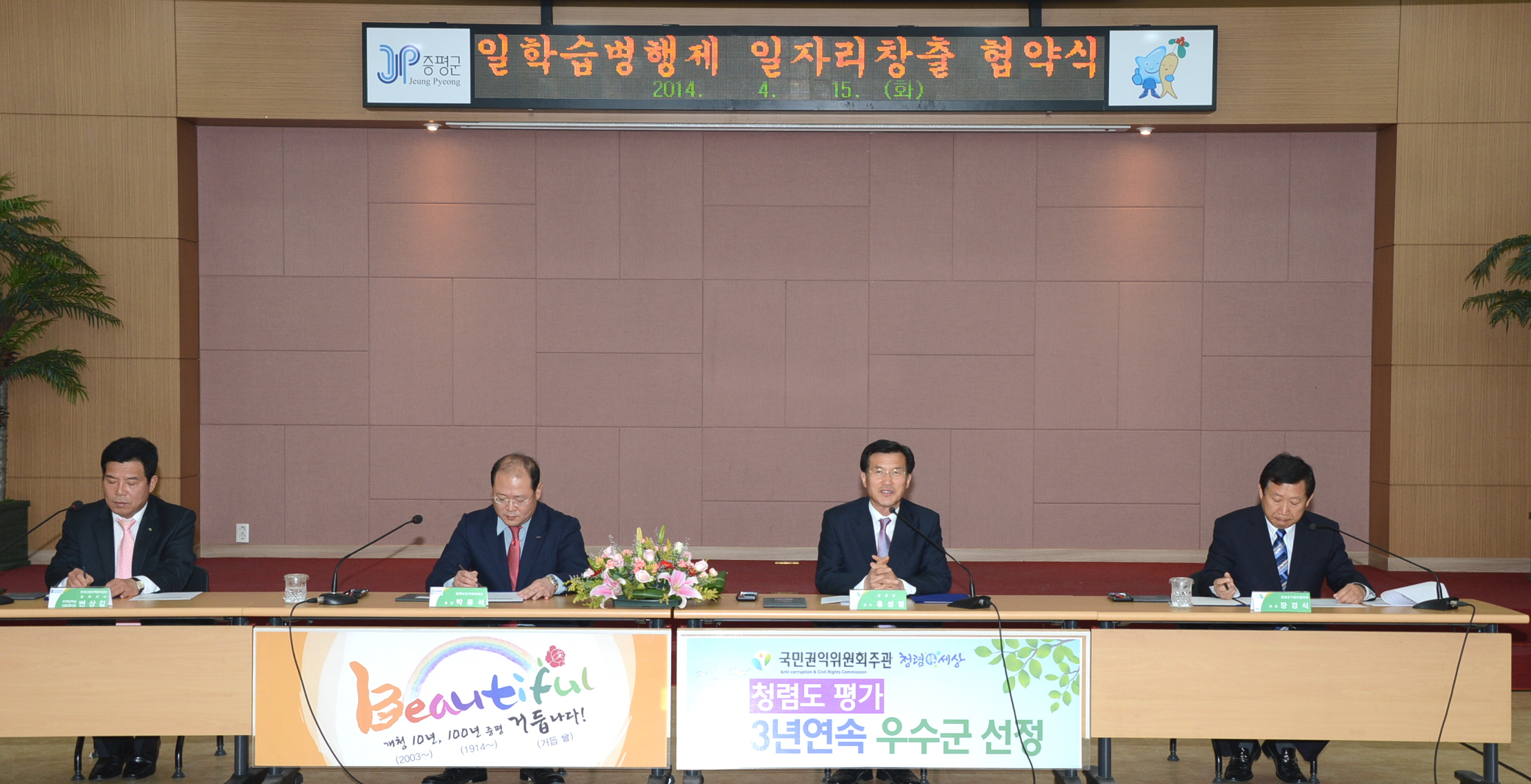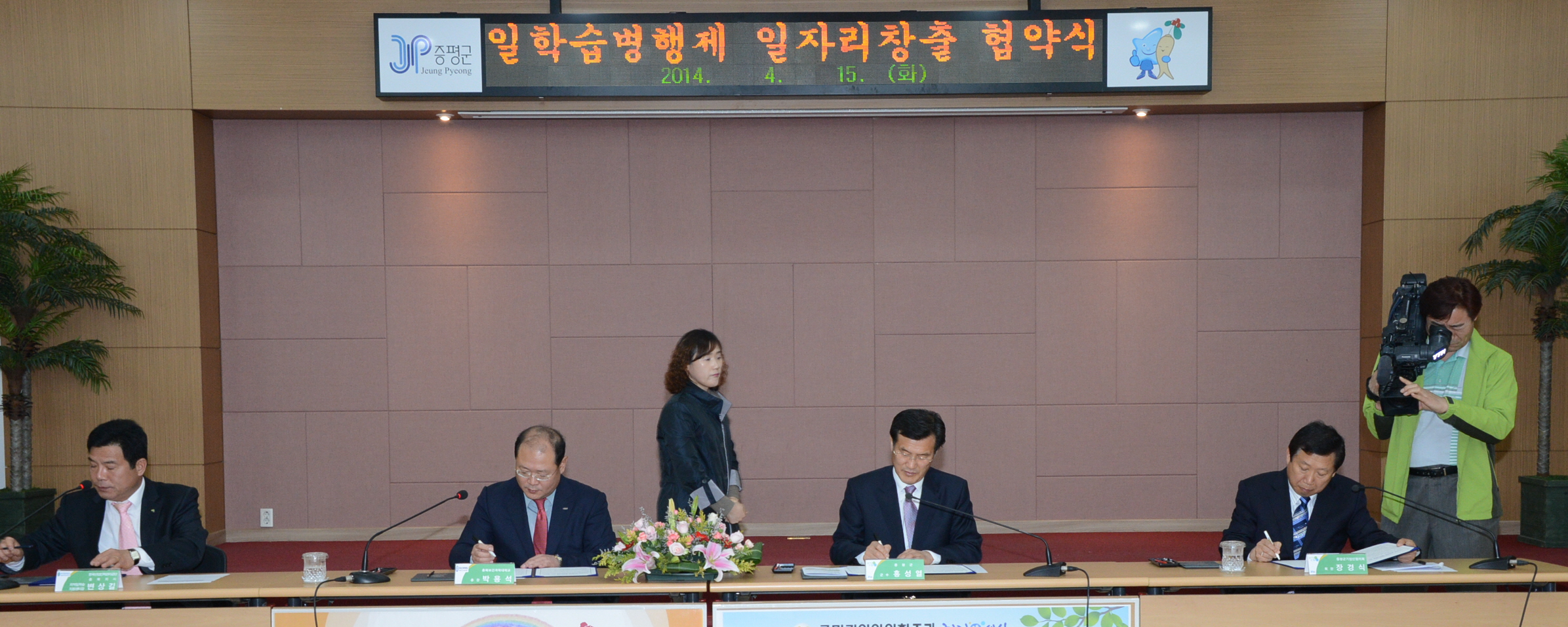 증평군이 지역경제활성화 및 일자리 창출을 위한 ‘일과 학습 병행제’ 산·관·학 업무협약을 전국 최초로 체결하며 능력중심사회 구현에 한층 다가서고 있다. [보도자료실 참조]