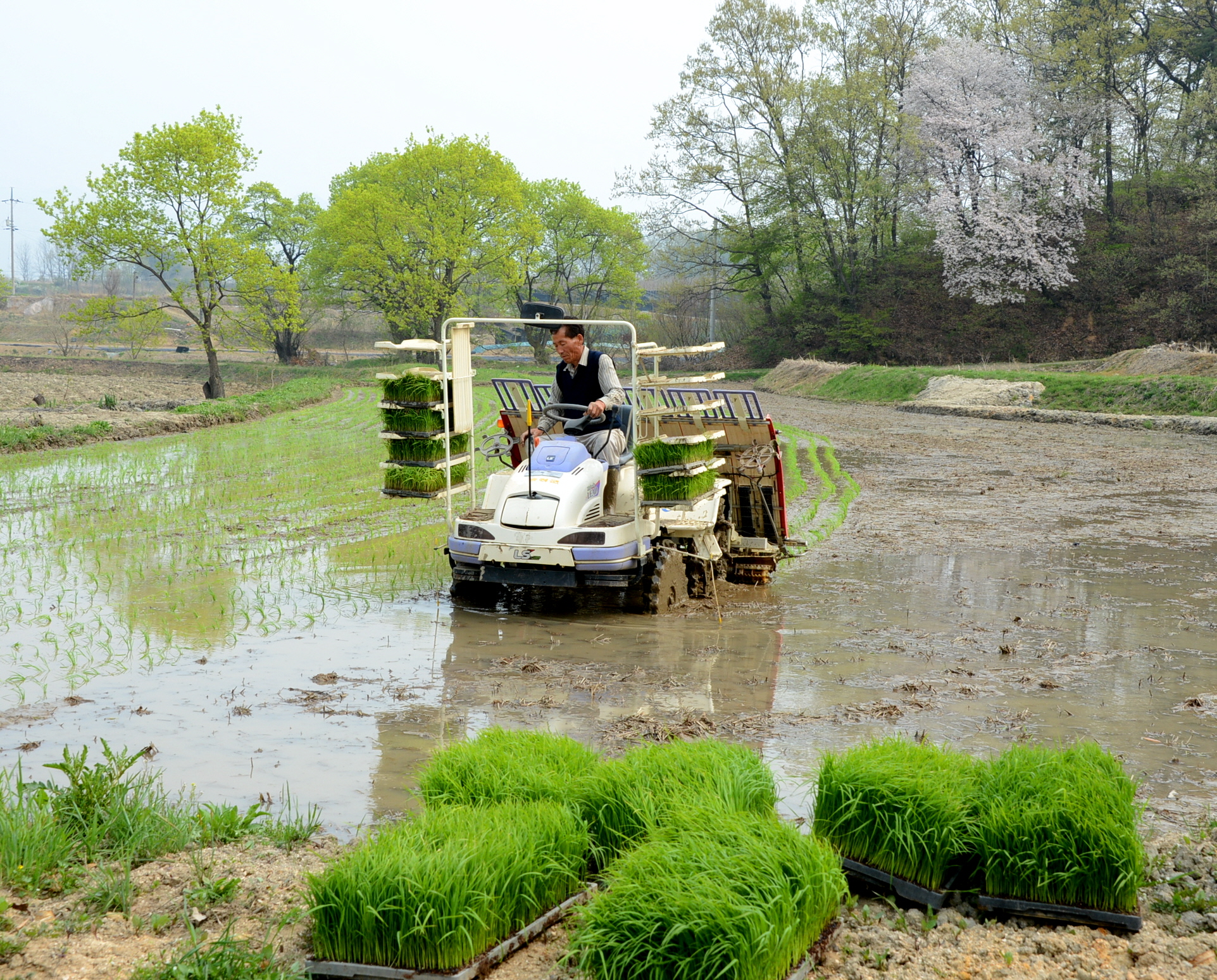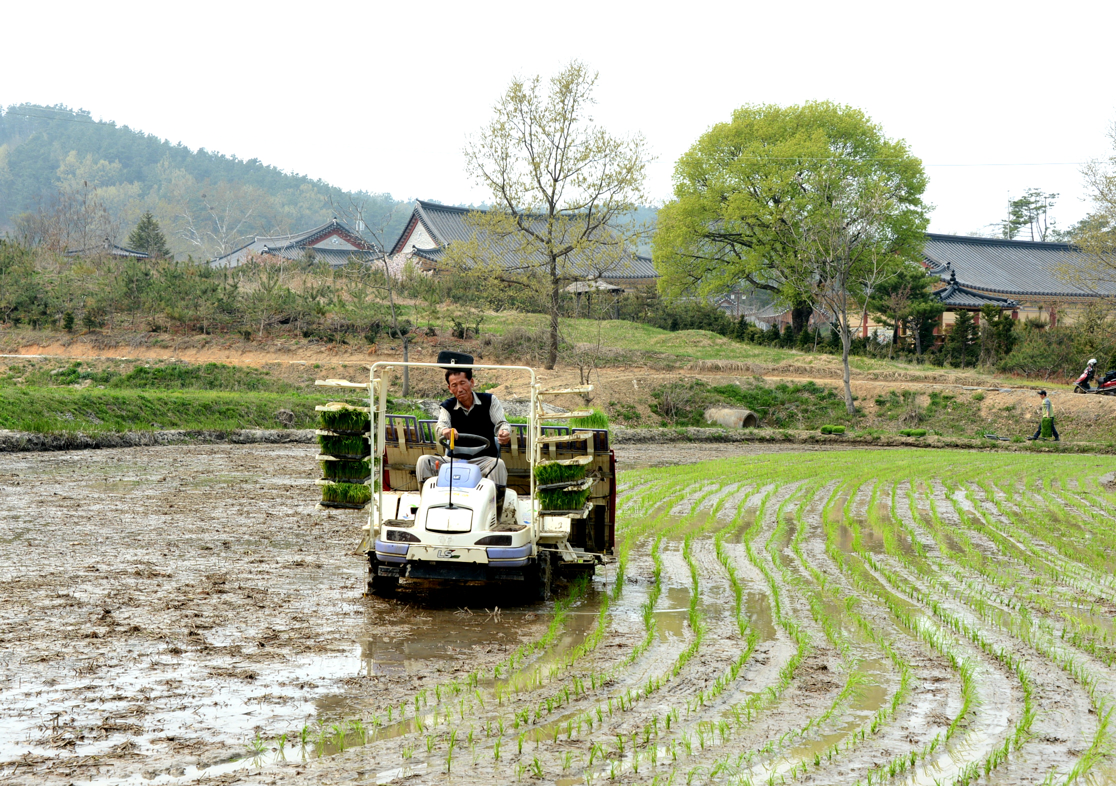 15일 오후 2시 증평읍 남하2리 둔덕마을 증평민속체험박물관 앞 논 3300여 ㎡에서는 농촌진흥청이 개발한 조생종 벼 "오대"를 두레놀이 보존회 양철주씨가 이앙기로 도내에서는 처음 으로 모내기했다